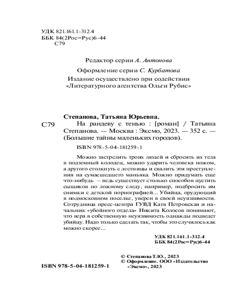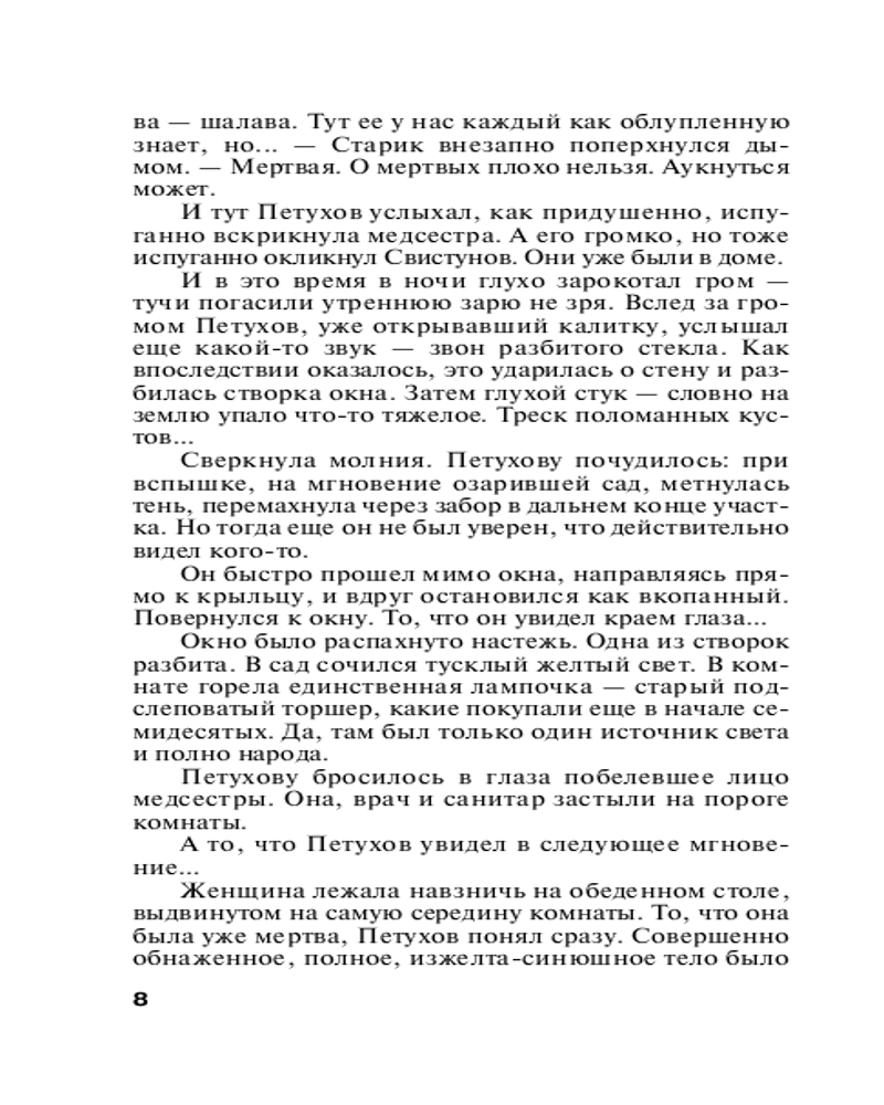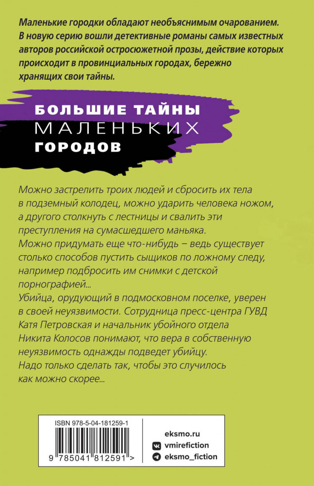 На рандеву с теньюВ данный момент этот товар отсутствует в продаже. Возможно, у нас найдется аналогичный или похожий товар здесь. Серия: Большие тайны маленьких городов (обложка) Можно застрелить троих людей и сбросить их тела в подземный колодец, можно ударить человека ножом, а другого столкнуть с лестницы и свалить эти преступления на сумасшедшего маньяка. Можно придумать еще что-нибудь — ведь существует столько способов пустить сыщиков по ложному следу, например, подбросить им снимки с детской порнографией... Убийца, орудующий в подмосковном поселке, уверен в своей неуязвимости. Сотрудница Пресс-центра ГУВД Катя Петровская и начальник «убойного отдела» Никита Колосов понимают, что вера в собственную неуязвимость однажды подведет убийцу. Надо только сделать так, чтобы это случилось как можно скорее... |