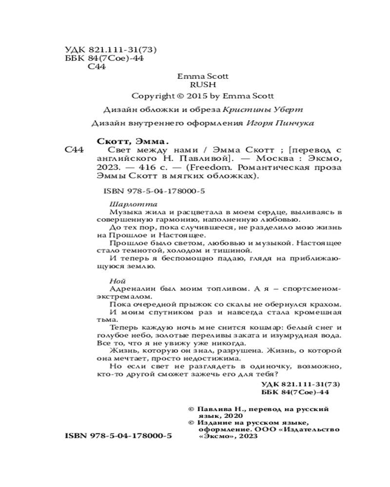 💳 Оплатить за товар можно при получении 🇰🇿 Есть бесплатная доставка по Казахстану от 1 дня 🎁 Копите бонусы с каждой покупки Романтические бестселлеры Эммы Скотт в новом, стильном оформлении. Удобный формат, мягкая обложка — все для того, чтобы не расставаться с любимыми героями. Уникальные яркие узоры на обрезе, блестящая фольга — собери всю коллекцию на своей полке! Книга про любовь виртуозной скрипачки, потерявшей свою внутреннюю музыку, и экстремала, лишившегося зрения. Но если свет не разглядеть в одиночку, возможно, кто-то другой сможет зажечь его для тебя? |