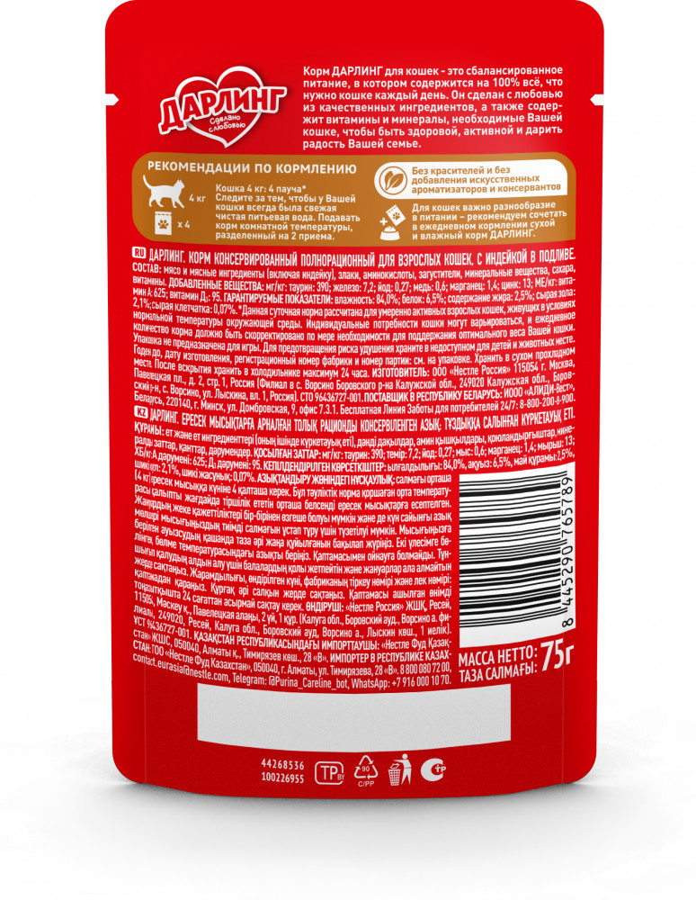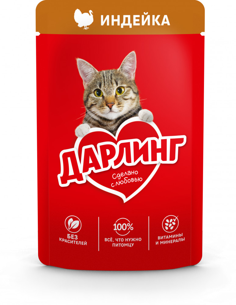 До этого брала своим в основном Felix и Friskies. Для разнообразия заказала Дарлинг (говядина, индейка, лосось и курица). У кота есть такая привычка - если найдёт пакетик с кормом, то в зубах тащит его к своей миске и опускает в неё. Для интереса разложили перед ним несколько пакетов - Felix, Friskies, Pro Plan, Whiskas и Дарлинг. А он схватил именно Дарлинг! И съел потом с аппетитом "честно заработанное". И кошка тоже ест этот корм с удовольствием. Однозначно буду заказывать ещё.