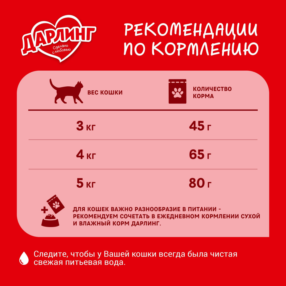 Добрый день! Коту всегда покупаем Корм для стерилизованных кошек и кастрированных котов Cat Chow «Special Care Sterill», в этот раз купила тот же самый корм и корм "Darling" для пробы так как недорогой, так котик начал просить еще и еще корма дарлинг пока он не закончился, а прежний игнорировал. В следующий раз планируем купить такой корм уже 10кг)) Недорого, а главное нравится коту)Спасибо! Правда, доставку ждали дней 10, не знаю у всех ли так.