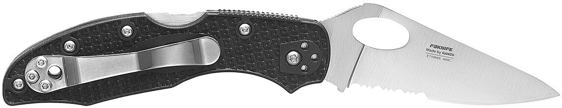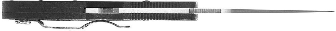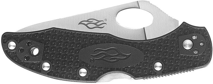 Нож оснащен изящным клинком длиной 75 миллиметров и толщиной 2.8 миллиметров. В нем присутствует овальное отверстие, которое не только способствует снижению общего веса конструкции до 67 грамм, но и облегчает раскрытие инструмента. Для этого необходимо вставить палец в отверстие и раскрыть клинок до фиксации. Клинок удерживается в открытом положении за счет замка Back Lock — простого в эксплуатации механизма с подпружиненным рычагом. Клинок данной модели имеет комбинированное лезвие: половина лезвия ближе к основанию имеет серрейторную заточку, а вторая половина — прямую заточку. Классическая прямая заточка — это универсальное лезвие для большинства повседневных задач, в которых необходим ровный рез, в то время как серрейтор отличается более продолжительным удержанием остроты и предназначен для выполнения специфических задач. Зубчатая кромка эффективно справляется с резом волокнистых материалов, таких как стропы, веревки и канаты, а также позволяет быстро срезать мелкие ветки или заточить деревянные колья.