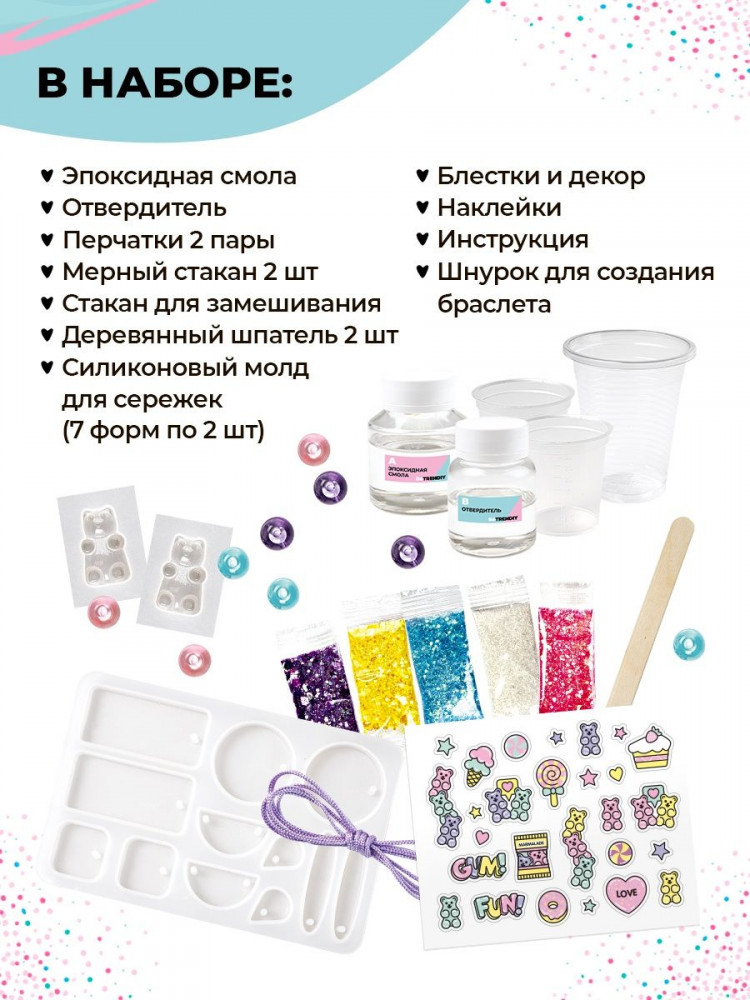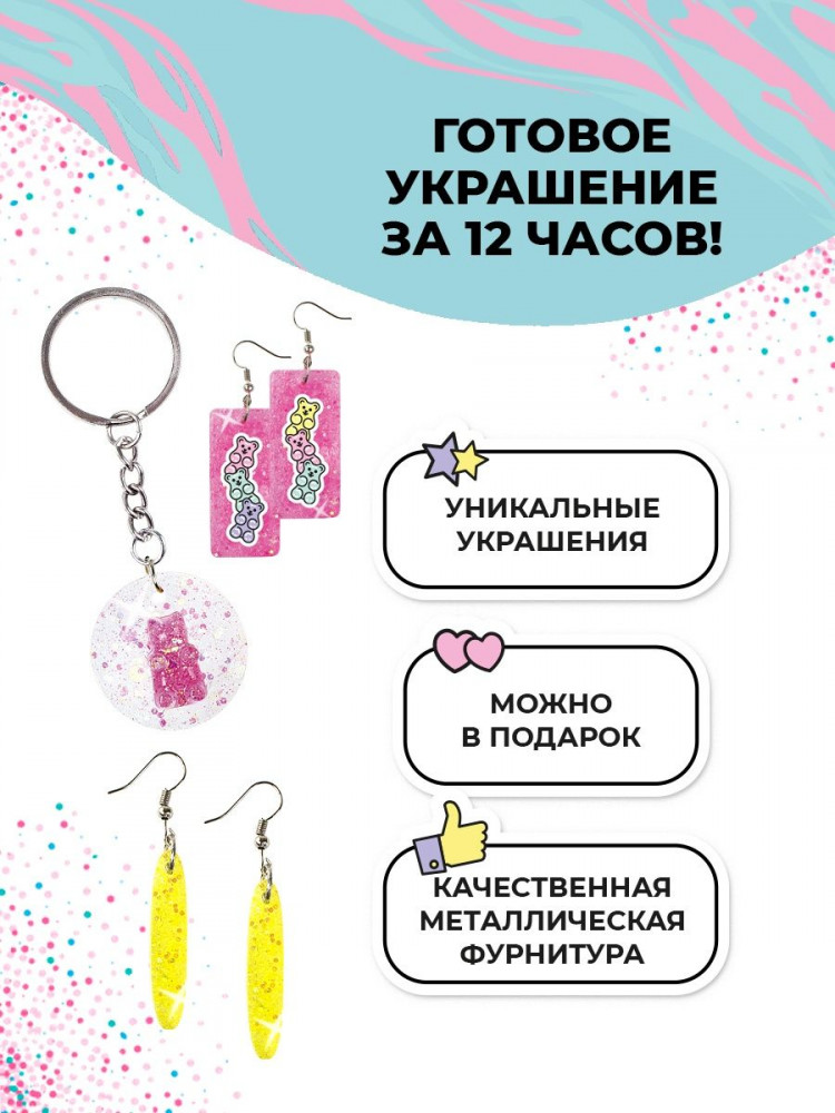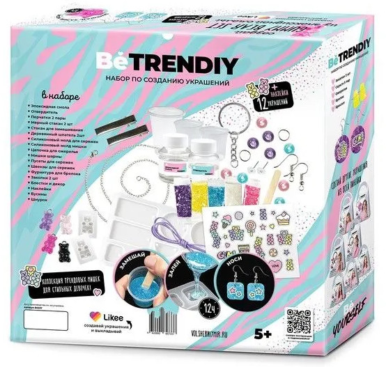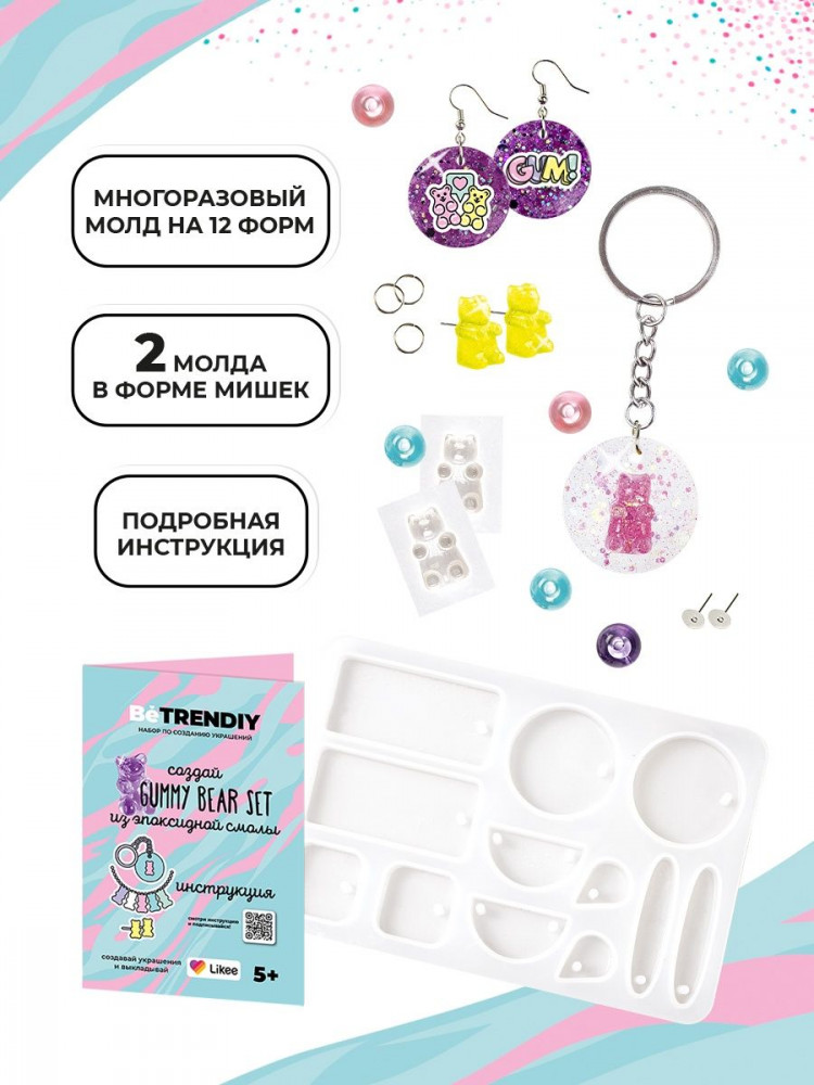 Набор для творчества для девочек с мишками Gummy BeTrenDIY — большой набор для создания украшений из эпоксидной смолы. Сережки, браслеты, кулоны с прикольными и модными мишками Gummy, а также других форм! Будь в тренде! Проявляй индивидуальность! Развивай творческие способности — вот слоган подарочных наборов для девочки Be TrenDIY. Эпоксидная смола для творчества — модный и простой материал для создания украшений и бижутерии. Для рукоделия не потребуются дополнительные инструменты или приборы. Никаких УФ ламп! В набор входит все необходимое для создания стильной детской бижутерии!