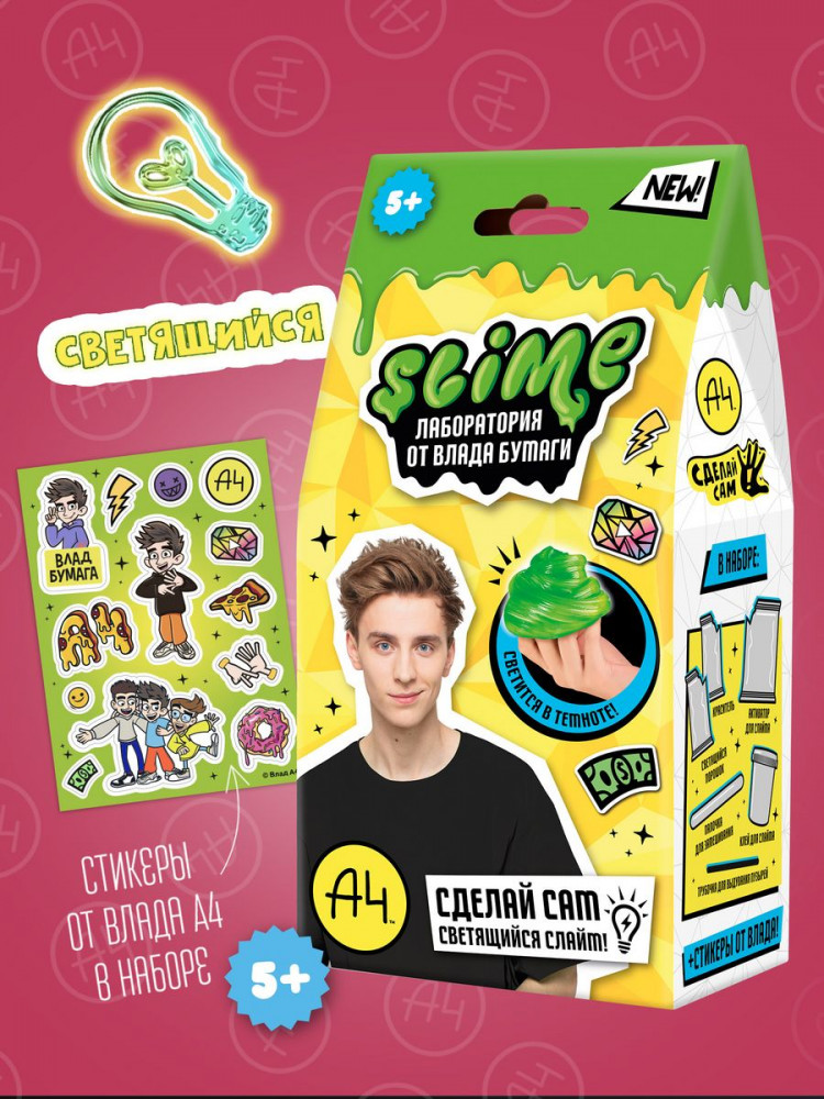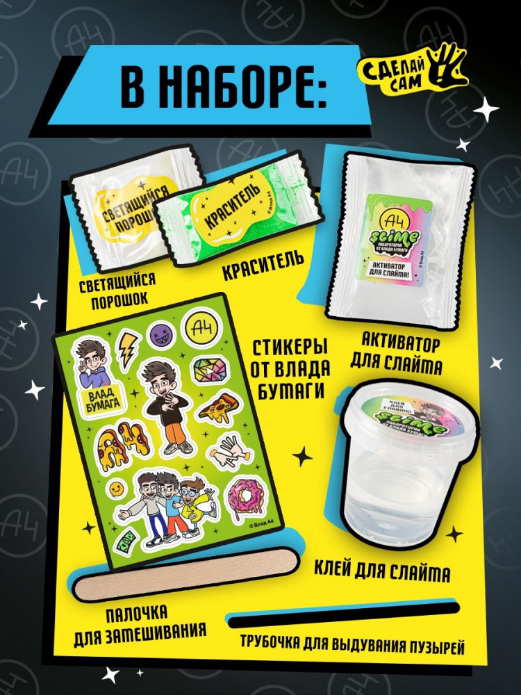Slime Набор для создания слайма «Slime лаборатория»В данный момент этот товар отсутствует в продаже. Возможно, у нас найдется аналогичный или похожий товар здесь. Что может быть интереснее игры со слаймом? Сделать слайм самому! Новейшая линейка наборов для детского творчества Slime Лаборатория by Влад Бумага А4 поможет тебе в этом челлендже! Набор с топовым блогером А4 Влад Бумага не оставит ни одного ребенка и подростка равнодушным! В наборе есть подробная инструкция по созданию слайма и все необходимое для успешного опыта: краситель, волшебный порошок, активатор для слайма, палочка для замешивания, клей для слайма, а также уникальные стикеры VLAD A4. |