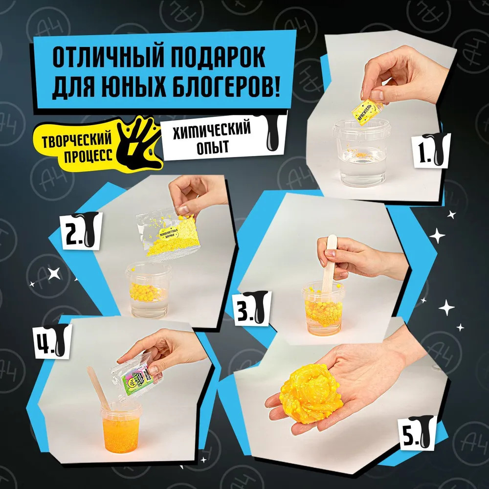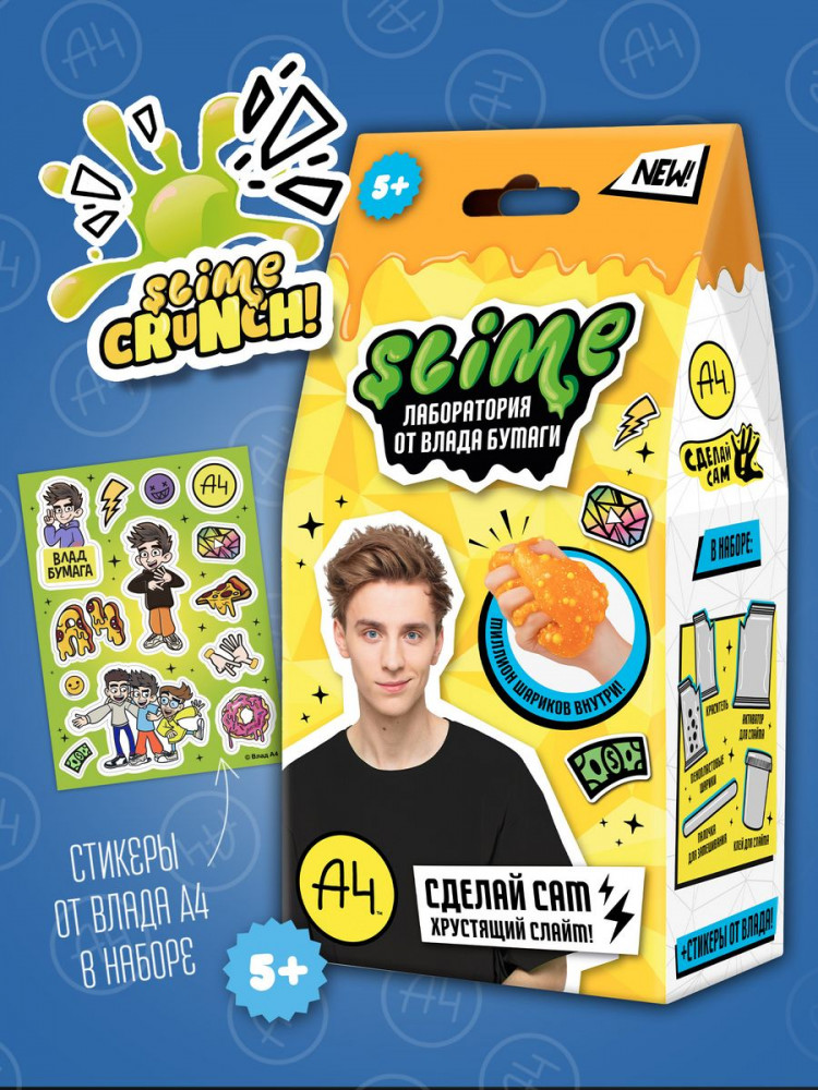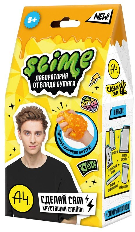 Что может быть интереснее игры со слаймом? Сделать слайм самому! Новейшая линейка наборов для детского творчества Slime Лаборатория by Влад Бумага А4 поможет тебе в этом челлендже! Набор с топовым блогером А4 Влад Бумага не оставит ни одного ребенка и подростка равнодушным! В наборе есть подробная инструкция по созданию слайма и все необходимое для успешного опыта: краситель, волшебный порошок, активатор для слайма, палочка для замешивания, клей для слайма, а также уникальные стикеры VLAD A4.