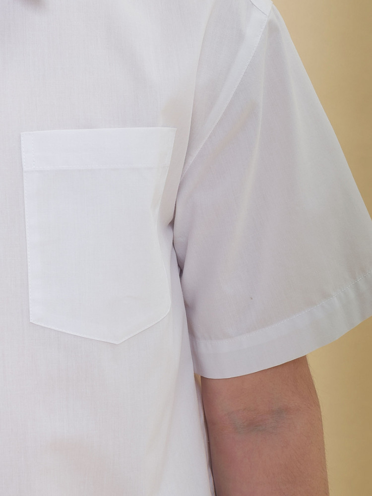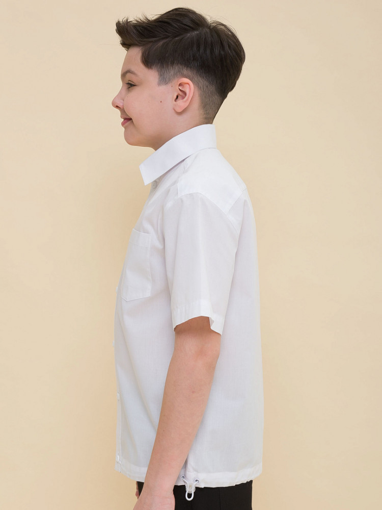 Школьная рубашка прямого силуэта для мальчика. В составе ткани преобладает хлопок — модель мягкая, тактильно приятная и пропускает воздух. Благодаря полиэстеру изделие сохраняет форму и отличный внешний вид. Рубашка немного укорочена, по переду дополнена накладным карманом — актуально и стильно. По низу утяжка эластичным шнуром со стопперами — можно регулировать объём и менять силуэт. Лаконичный дизайн позволяет сочетать эту модель с различными брюками, пиджаками, жилетами. Стильный и практичный вариант школьной одежды для мальчиков. Идеально белый цвет без желтого и серого оттенка.