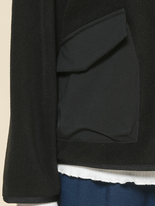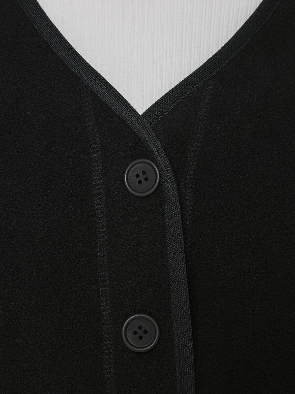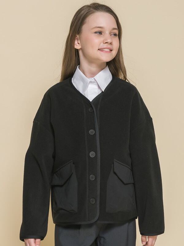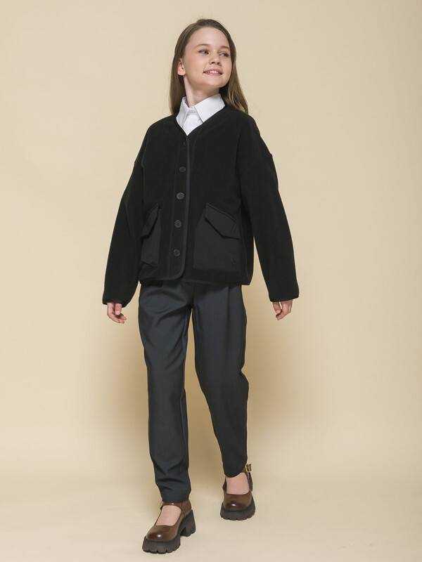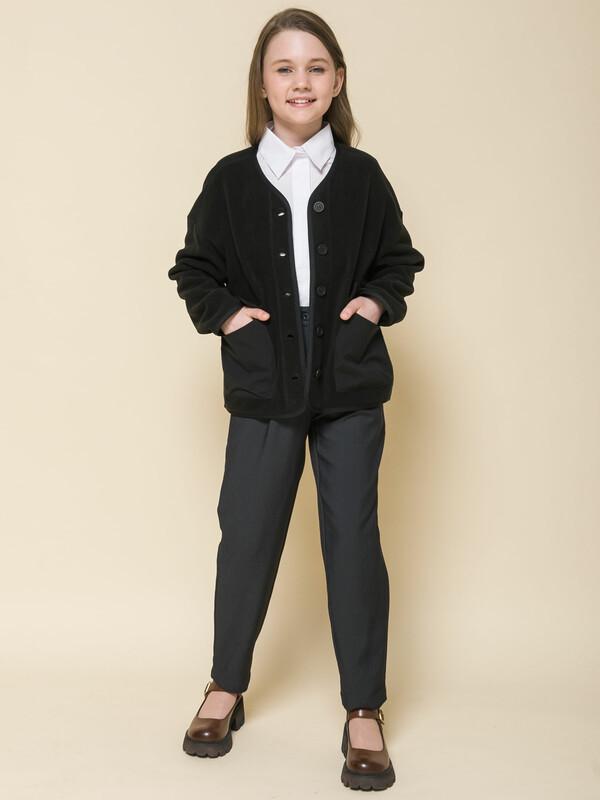 Кардиган из флиса для девочек. Свободный крой, застёжка на пуговицы, накладные карманы из курточной ткани. Горловина, борта, карманы, манжеты и низ изделия окантованы декоративной трикотажной тесьмой.