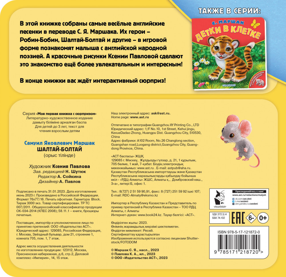 💳 Оплатить за товар можно при получении 🇰🇿 Есть бесплатная доставка по Казахстану от 1 дня 🎁 Копите бонусы с каждой покупки Серия: Моя первая книжка с сюрпризом В этой книжке собраны самые весёлые английские песенки в переводе С. Я. Маршака. Их герои — Робин-Бобин, Шалтай-Болтай и другие — в игровой форме познакомят малыша с английской народной поэзией. А красочные рисунки Ксении Павловой сделают это знакомство ещё более увлекательным и интересным! |