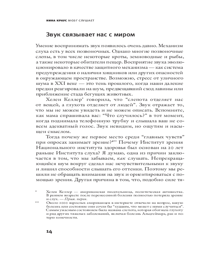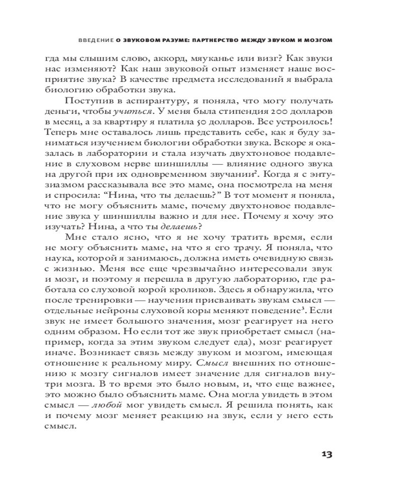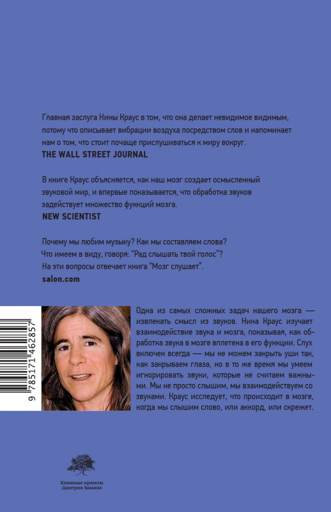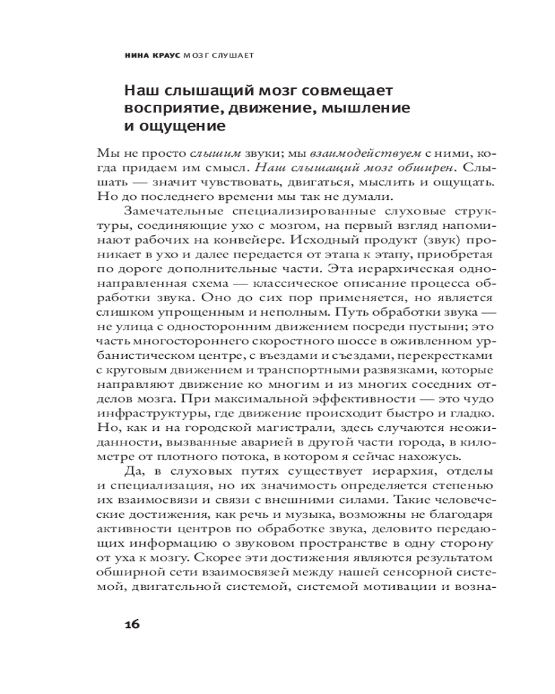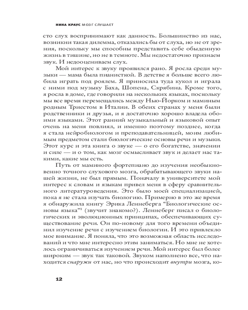 💳 Оплатить за товар можно при получении 🇰🇿 Есть бесплатная доставка по Казахстану от 1 дня 🎁 Копите бонусы с каждой покупки Серия: Элементы 2.0 Наш слышащий мозг обширен — это нечто большее, чем просто прибор для обработки звука. Нина Краус рассказывает, как он воздействует на наши эмоции, мысли, движения. Слуховые нейроны обрабатывают информацию за тысячную долю секунды, и слух — самый быстрый из всех чувств. Краус описывает исцеляющую силу музыки и разрушающую силу шума. Она отслеживает, что происходит с мозгом, когда мы говорим на иностранном языке, страдаем от речевых нарушений, воспринимаем ритм, слушаем пение птиц или получаем сотрясение мозга. Краус показывает, что взаимодействие со звуком накладывает неизгладимый отпечаток на то, кто мы есть. Звуки вокруг нас влияют на наш мозг и — к худу или к добру — помогают нам строить звуковой мир, в котором мы живем. |