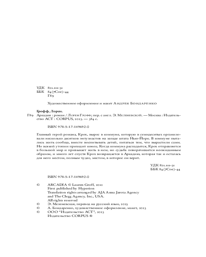 💳 Оплатить за товар можно при получении 🇰🇿 Есть бесплатная доставка по Казахстану от 1 дня 🎁 Копите бонусы с каждой покупки Серия: Corpus Главный герой романа, Крох, вырос в коммуне, которую в семидесятых организовали несколько десятков энтузиастов на западе штата Нью-Йорк. В коммуне пытались жить сообща, вместе воспитывать детей, питаться тем, что вырастили сами. Но всякой утопии приходит конец. Когда коммуна распадается, Крох отправляется в большой мир и привыкает жить в нем, но судьба поворачивается неожиданным образом, и много лет спустя Крох возвращается в Аркадию, которая так и осталась для него местом, полным чудеc, местом, в которое он верит. |