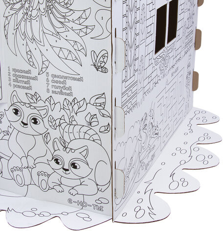 Домик-раскраска изготовлен из 100% безопасного, экологически чистого материала — гофрированного картона. Все стороны домика разные по дизайну, толстый контур у рисунков поможет малышу аккуратно их раскрасить любыми фломастерами, красками, карандашами, восковыми мелками. Полянка вокруг домика не даст испачкать ковер или пол красками. Все края домика имеют закругленную форму и безопасны для ребенка.