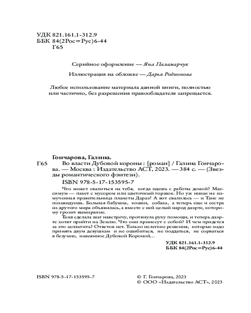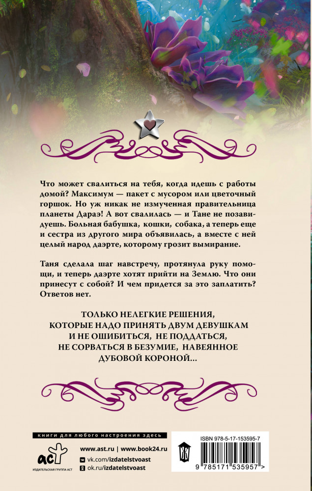 💳 Оплатить за товар можно при получении 🇰🇿 Есть бесплатная доставка по Казахстану 🎁 Копите бонусы с каждой покупки Серия: Звезды романтического фэнтези Что может свалиться на тебя, когда идешь с работы домой? Максимум — пакет с мусором или цветочный горшок. Но уж никак не измученная правительница планеты Дараэ! А вот свалилась — и Тане не позавидуешь. Больная бабушка, кошки, собака, а теперь еще и сестра из другого мира объявилась, а вместе с ней целый народ даэрте, которому грозит вымирание. |