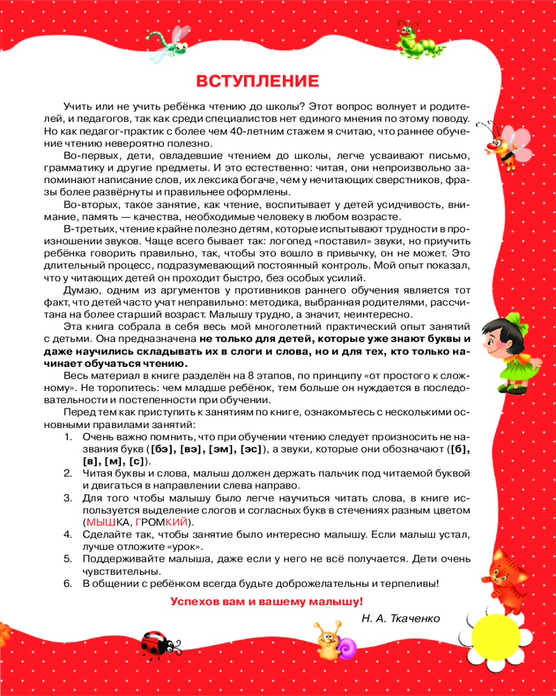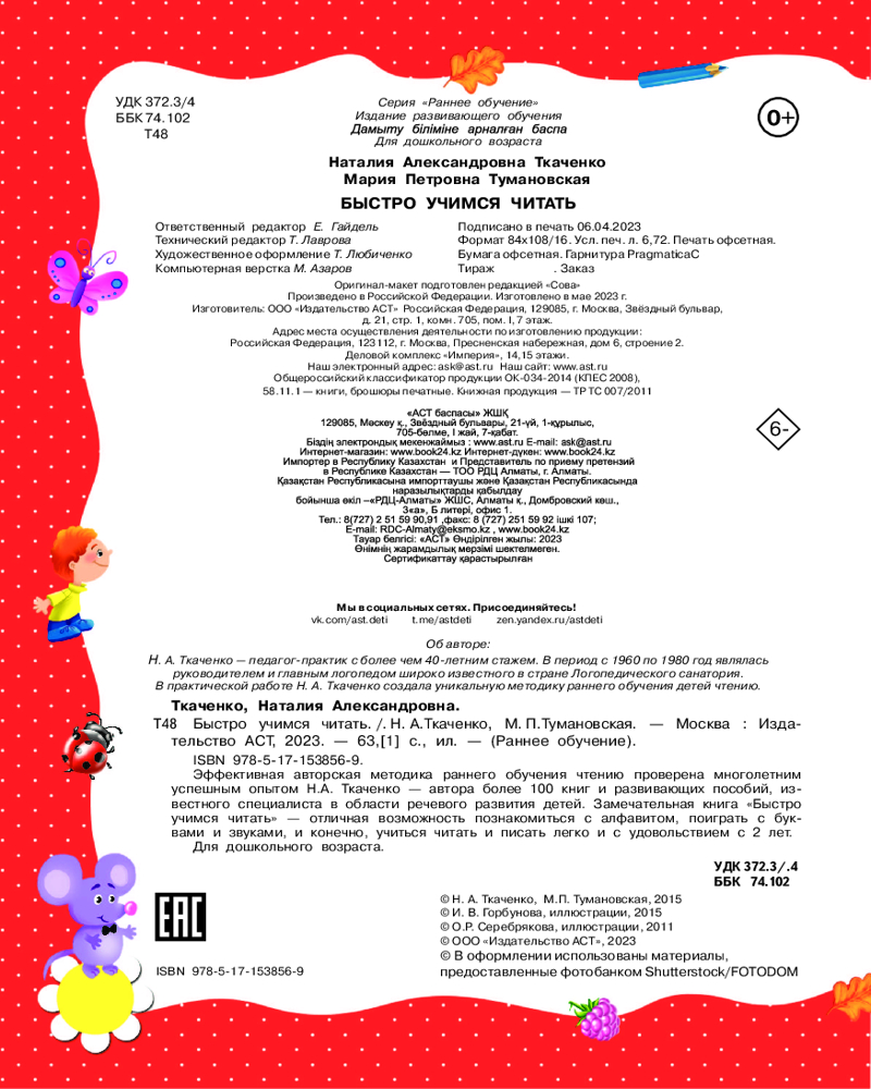 Серия: Раннее обучение Эффективная авторская методика раннего обучения чтению проверена многолетним успешным опытом Н.А. Ткаченко — автора более 100 книг и развивающих пособий, известного специалиста в области речевого развития детей. Замечательная книга «Быстро учимся читать: раннее обучение» — отличная возможность познакомиться с алфавитом, поиграть с буквами и звуками, и конечно, учиться читать и писать легко и с удовольствием с 2 лет. |