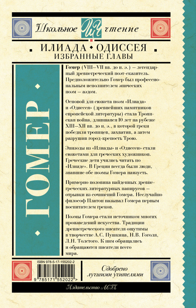 💳 Оплатить за товар можно при получении 🇰🇿 Есть бесплатная доставка по Казахстану от 1 дня 🎁 Копите бонусы с каждой покупки Серия: Школьное чтение Гоме́р (VIII-VII вв. до н.) — легендарный древнегреческий поэт-сказитель, создатель эпических поэм «Илиада» (древнейшего памятника европейской литературы) и «Одиссея». |