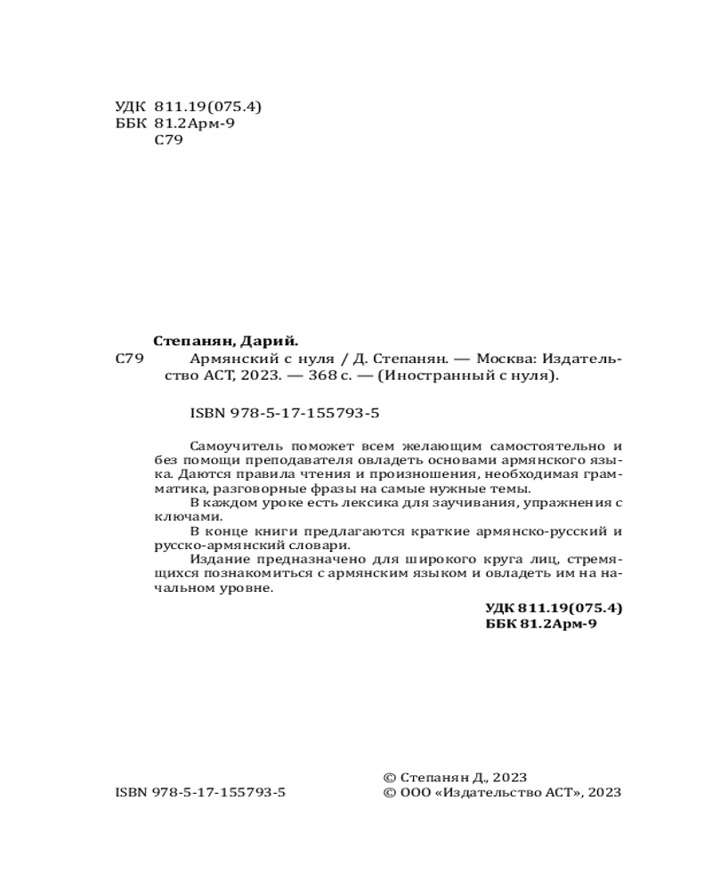 💳 Оплатить за товар можно при получении 🇰🇿 Есть бесплатная доставка по Казахстану от 1 дня 🎁 Копите бонусы с каждой покупки Серия: Иностранный с нуля Самоучитель поможет всем желающим самостоятельно и без помощи преподавателя овладеть основами армянского языка. Даются правила чтения и произношения, необходимая грамматика, разговорные фразы на самые нужные темы. |