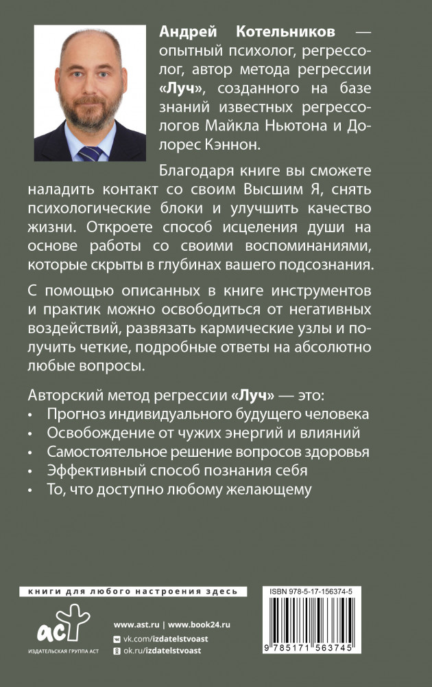 Регрессия. Решаем проблемы с помощью глубинной памятиВ данный момент этот товар отсутствует в продаже. Возможно, у нас найдется аналогичный или похожий товар здесь. Серия: Нонфикшн. Тайны знания Андрей Котельников — опытный психолог, регрессолог, автор метода регрессии «Луч», созданного на базе знаний известных регрессологов Майкла Ньютона и Долорес Кэннон. |