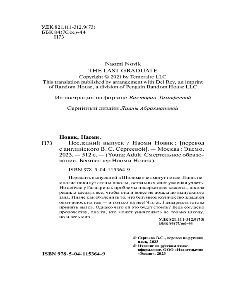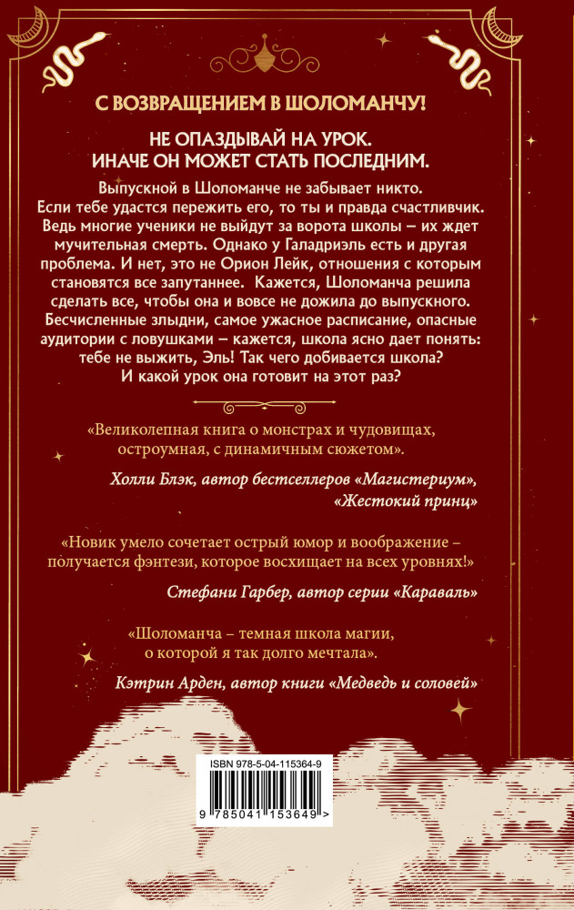 💳 Оплатить за товар можно при получении 🇰🇿 Есть бесплатная доставка по Казахстану от 1 дня 🎁 Копите бонусы с каждой покупки Серия: Young Adult. Смертельное образование. Бестселлер Наоми Новик «Не связывайся с Орионом Лейком». Что имела в виду мама, когда написала это послание? Вот о чем должна была бы думать Эль в свой последний год в Шоломанче. Однако магическая школа не оставила ей времени на эти размышления. Кажется, Шоломанча твердо решила сделать все, чтобы Эль и вовсе не дожила до выпускного. Иначе как объяснить все те ловушки, которые школа подстраивает ей? Что происходит? Что ждет Эль, Ориона и других учеников на выпускном? И кто из них по-настоящему готов пожертвовать всем — даже любовью, только бы избежать проклятия Шоломанчи? |