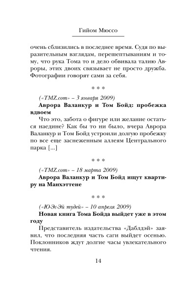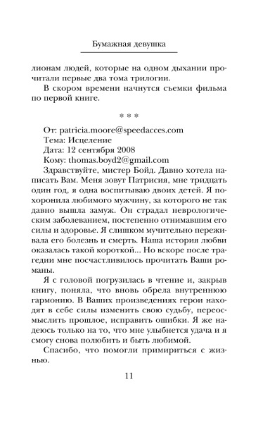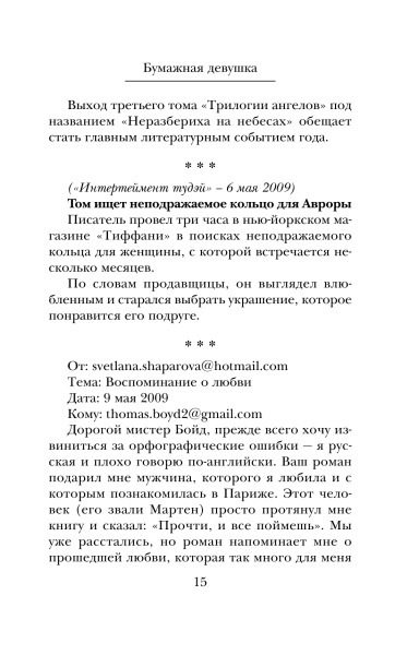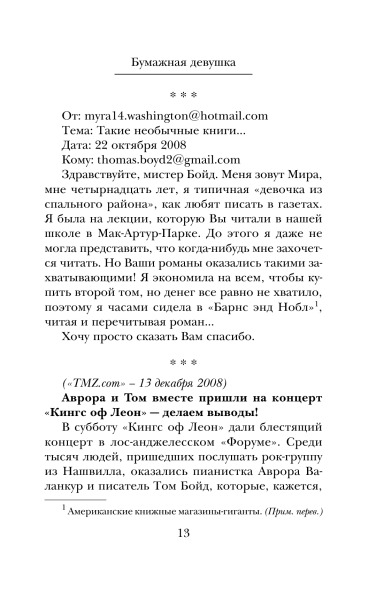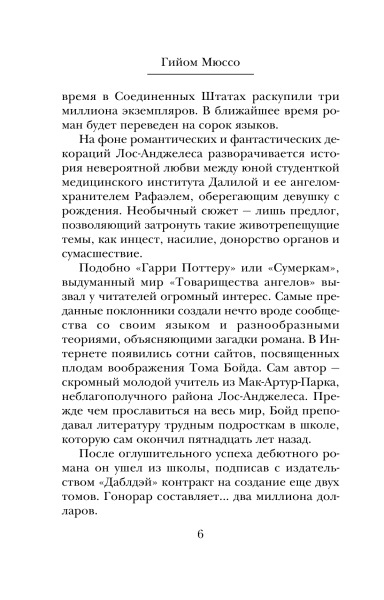Бумажная девушкаВ данный момент этот товар отсутствует в продаже. Возможно, у нас найдется аналогичный или похожий товар здесь. Серия: Романтика и страсть. Проза Гийома Мюссо Талантливый, успешный писатель Том Бойд переживает не лучшие времена — его бросила любимая девушка, он почти разорен, но главное — слова больше не хотят складываться в предложения, и ему кажется, что никогда в жизни он не напишет ни строчки. |