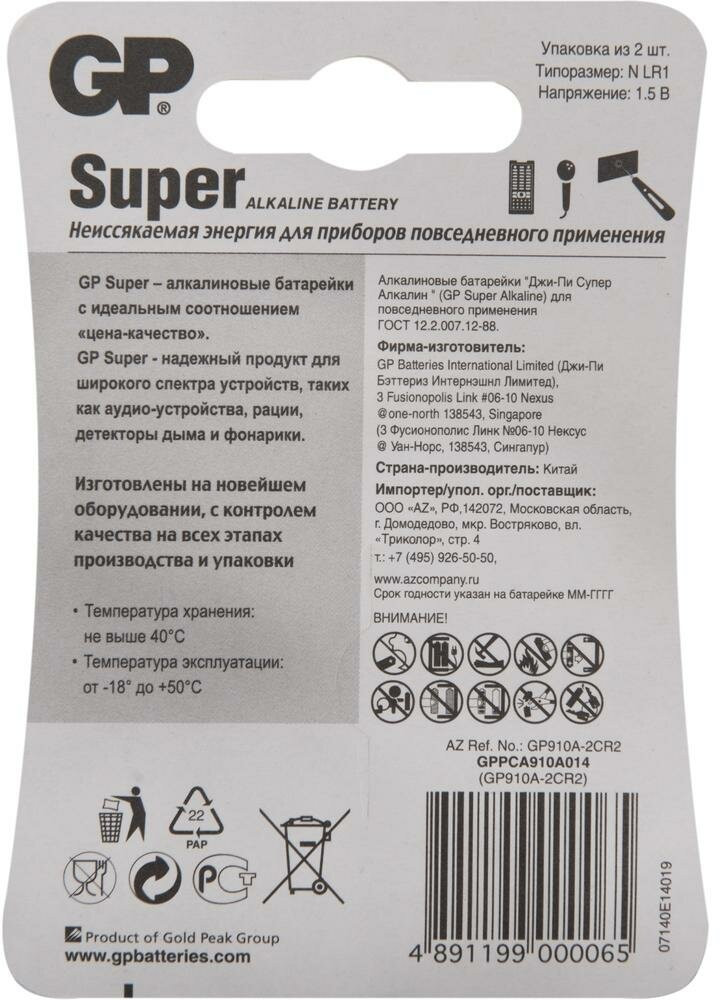 GP серии Super Alkaline – надежные батарейки с увеличенным сроком работы. Элементы питания типоразмера N (LR1/910A) обычно необходимы для работы лазерных указок, беспроводных дверных звонков, микрофонов, диктофонов и других портативных устройств. По сравнению с солевыми аналогами они прослужат в 3 раза дольше.