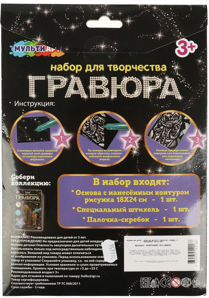 С помощью данного набора юный художник сможет создать эффектную серебристую картину на чёрном фоне. Контур рисунка уже нанесён на основу, остаётся только процарапать изображение специальным штихелем. Готовую поделку можно подарить близким или использовать для украшения интерьера.