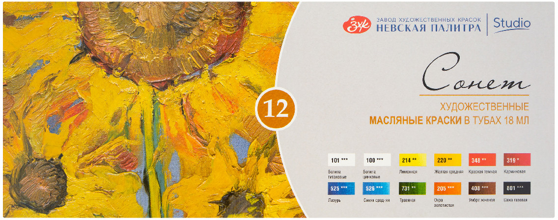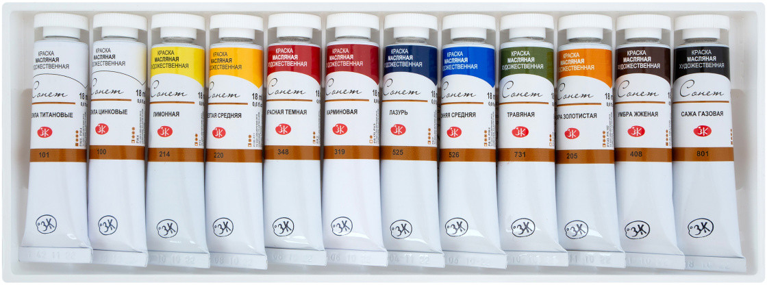 Художественные масляные краски серии «Сонет» разработаны с учетом потребностей начинающих живописцев. Изготавливаются на основе преимущественно комбинаций из нескольких пигментов и льняного масла в качестве связующего. Краски сбалансированы по времени высыхания, а смеси не приводят к нежелательным эффектам (высветление, потемнение). Палитра масляных красок в наборе «Сонет» состоит из 8 базовых цветов, необходимых начинающему художнику для работы.