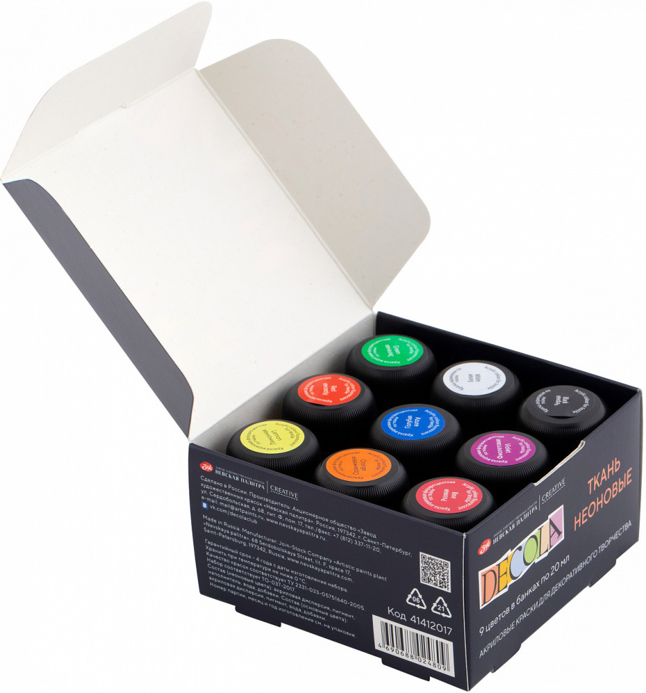 Акриловые краски по ткани «Decola» изготавливаются на основе водной акриловой дисперсии и образуют после высыхания прочную эластичную пленку на поверхности. Краски предназначены для росписи хлопчатобумажных и шелковых тканей. Допускается применение красок на синтетических тканях. При этом рекомендуется убедиться в прочности закрепления рисунка на образце ткани.