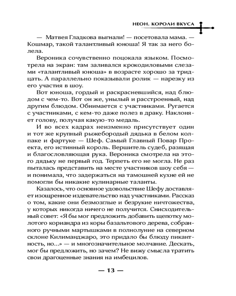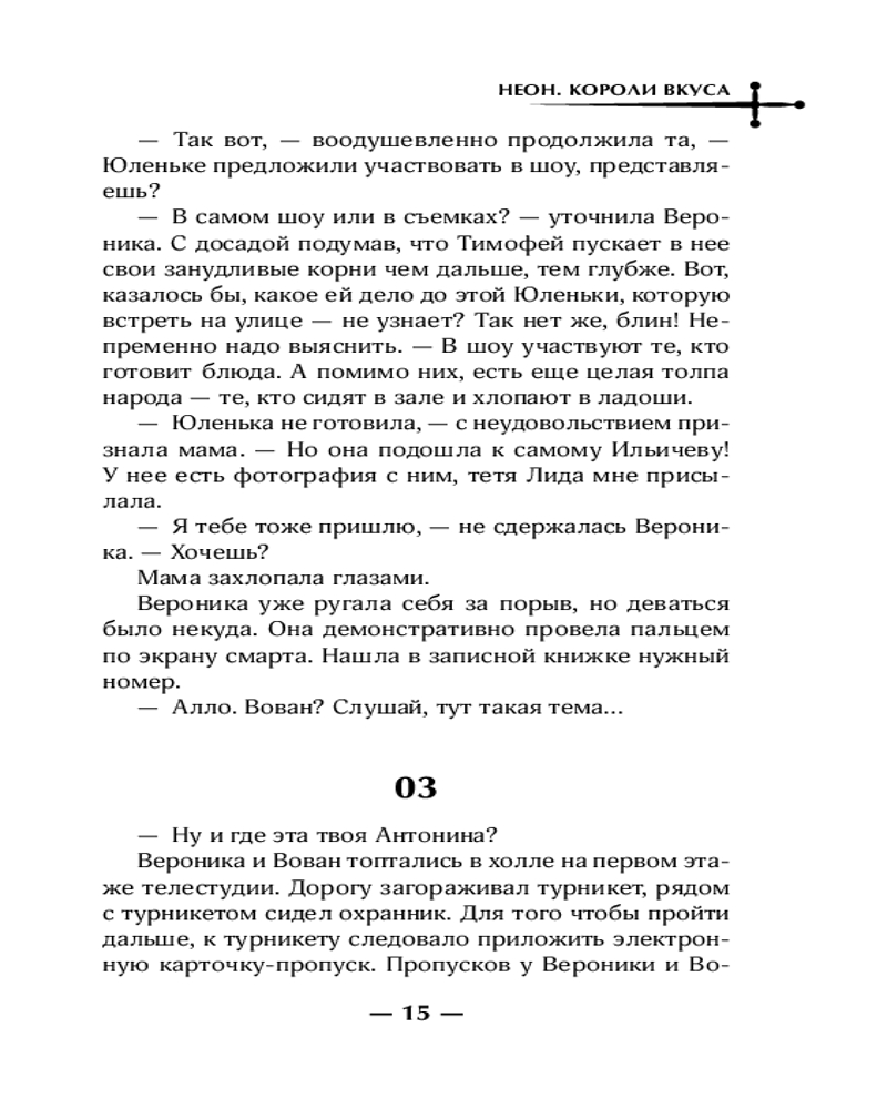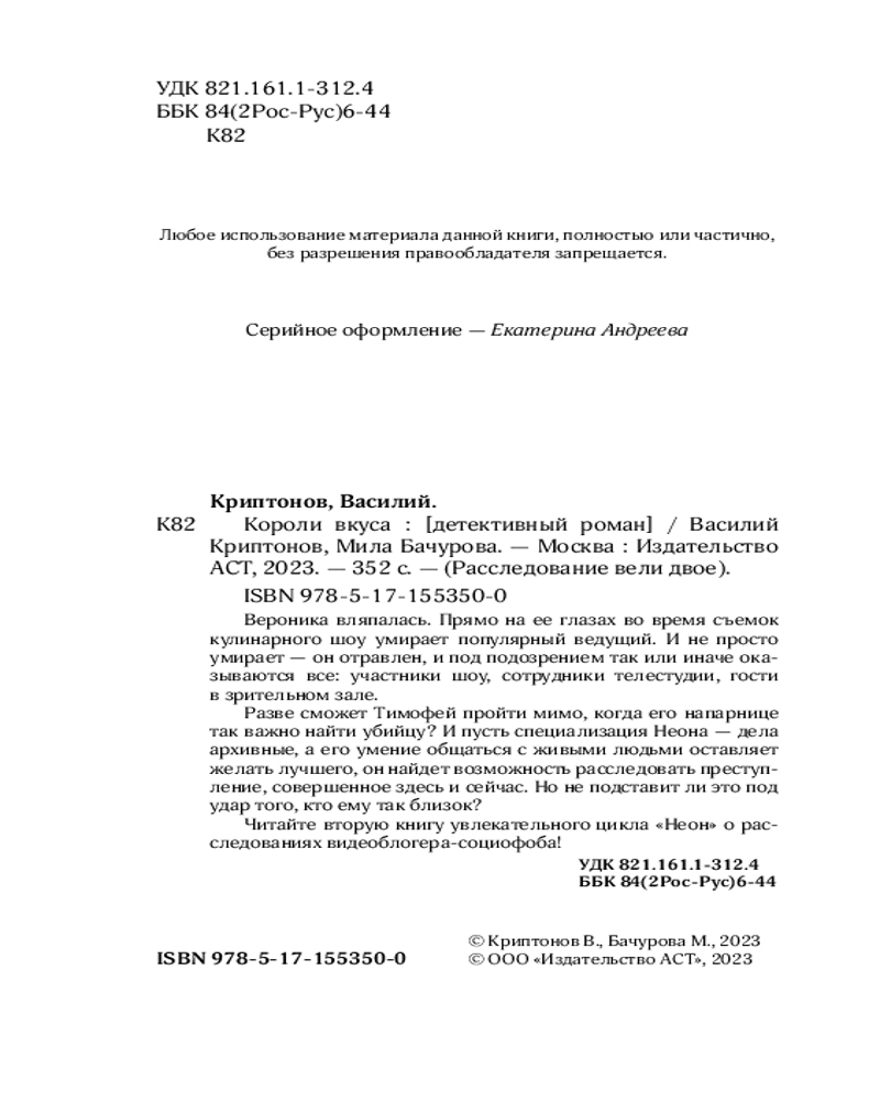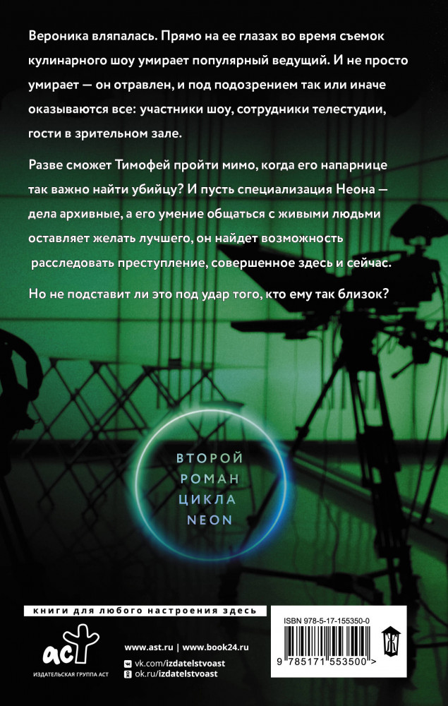 Серия: Расследование вели двое Вероника вляпалась. Прямо на ее глазах во время съемок кулинарного шоу умирает популярный ведущий. И не просто умирает — он отравлен, и под подозрением так или иначе оказываются все: участники шоу, сотрудники телестудии, гости в зрительном зале. Разве сможет Тимофей пройти мимо, когда его напарнице так важно найти убийцу? И пусть специализация Неона — дела архивные, а его умение общаться с живыми людьми оставляет желать лучшего, он найдет возможность расследовать преступление, совершенное здесь и сейчас. Но не подставит ли это под удар того, кто ему так близок? Читайте вторую книгу увлекательного цикла «Неон» о расследованиях видеоблогера-социофоба! |
