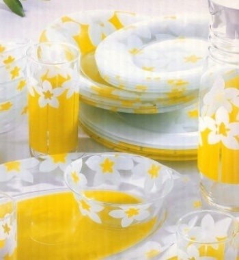 Пару лет назад подарили сервиз LUMINARC: синие и желтые тарелки с оранжевыми цветами ( Сейчас такой сняли с производства) И две тарелки разбились, приобрела на замен желтые и ярко синие (но уже без цветов), кое-какие блюда этих расцветок других размеров докупила, в общем теперь весь этот сборный комплект смотрится как полноценный сервиз!!!! Причем я смотрела такие тарелки на "посудном ряду", таких расцветок там нет! Спасибо Flip!