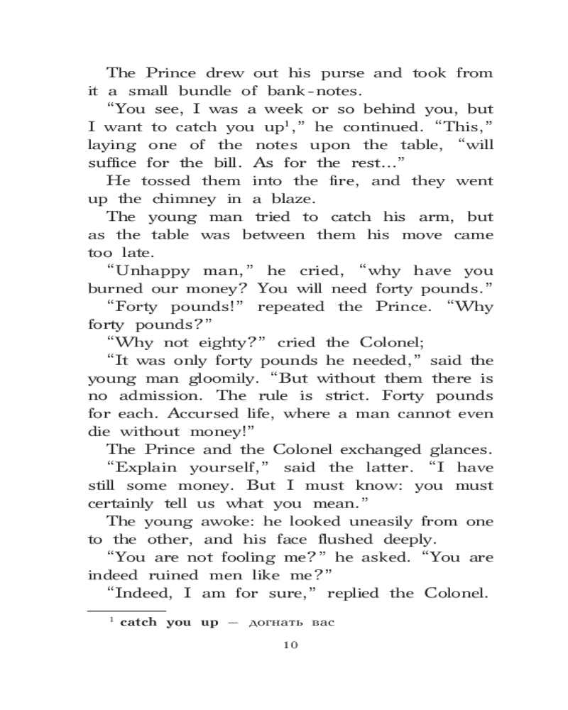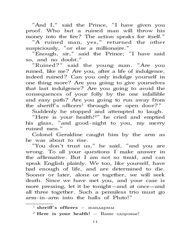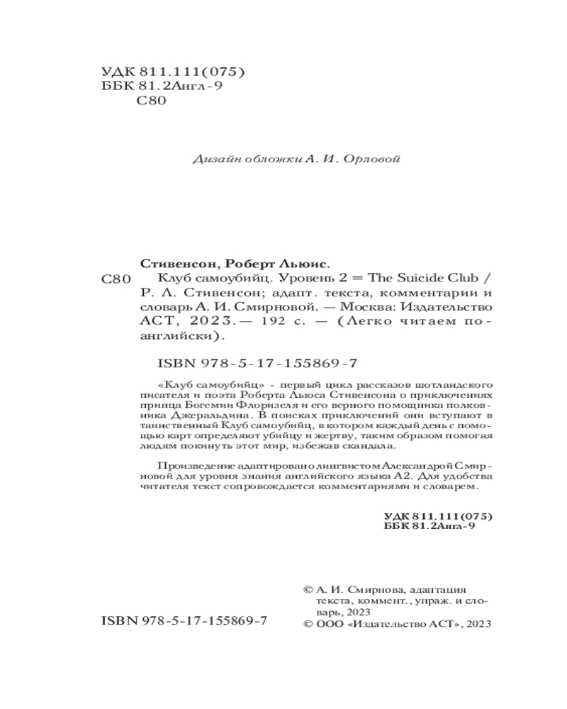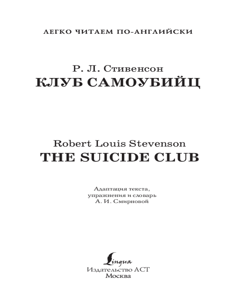 Клуб самоубийц. Уровень 2. The Suicide ClubВ данный момент этот товар отсутствует в продаже. Возможно, у нас найдется аналогичный или похожий товар здесь. Серия: Легко читаем по-английски «Клуб самоубийц» — первый цикл рассказов шотландского писателя и поэта Роберта Льюса Стивенсона о приключениях принца Богемии Флоризеля и его верного помощника полковника Джеральдина. В поисках приключений они вступают в таинственный Клуб самоубийц, в котором каждый день с помощью карт определяют убийцу и жертву, таким образом помогая людям покинуть этот мир, избежав скандала. Произведение адаптировано лингвистом Александрой Смирновой для уровня знания английского языка A2. Для удобства читателя текст сопровождается комментариями и словарем. |