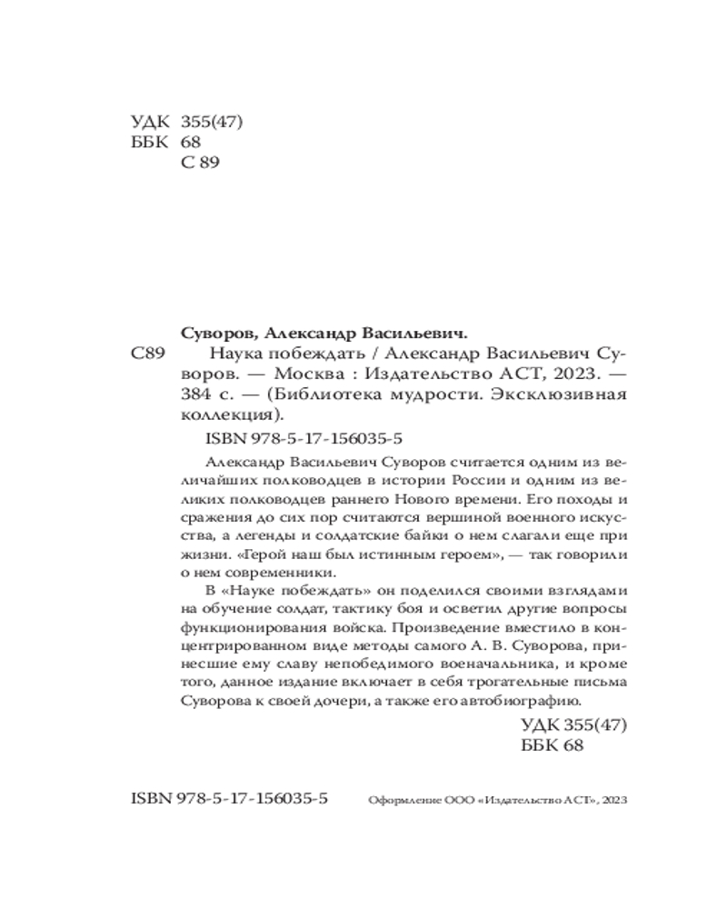 💳 Оплатить за товар можно при получении 🇰🇿 Есть бесплатная доставка по Казахстану от 1 дня 🎁 Копите бонусы с каждой покупки Серия: Библиотека мудрости. Эксклюзивная коллекция Александр Васильевич Суворов считается одним из величайших полководцев в истории России и одним из великих полководцев раннего Нового времени. Его походы и сражения до сих пор считаются вершиной военного искусства, а легенды и солдатские байки о нем слагали ещё при жизни. «Герой наш был истинным героем», — так говорили о нем современники.В «Науке побеждать» он поделился своими взглядами на обучение солдат, тактику боя и осветил другие вопросы функционирования войска. Произведение вместило в концентрированном виде методы самого А. В. Суворова, принёсшие ему славу непобедимого военачальника, и кроме того, данное издание включает в себя трогательные письма Суворова к своей дочери, а также его автобиографию. |