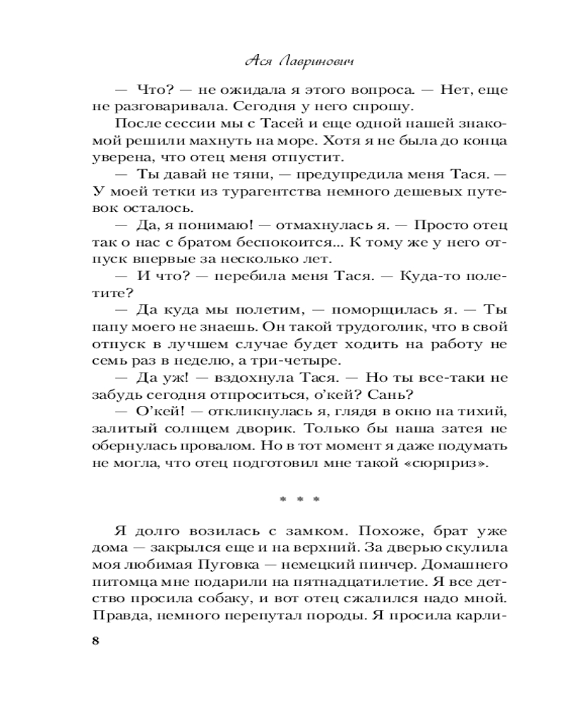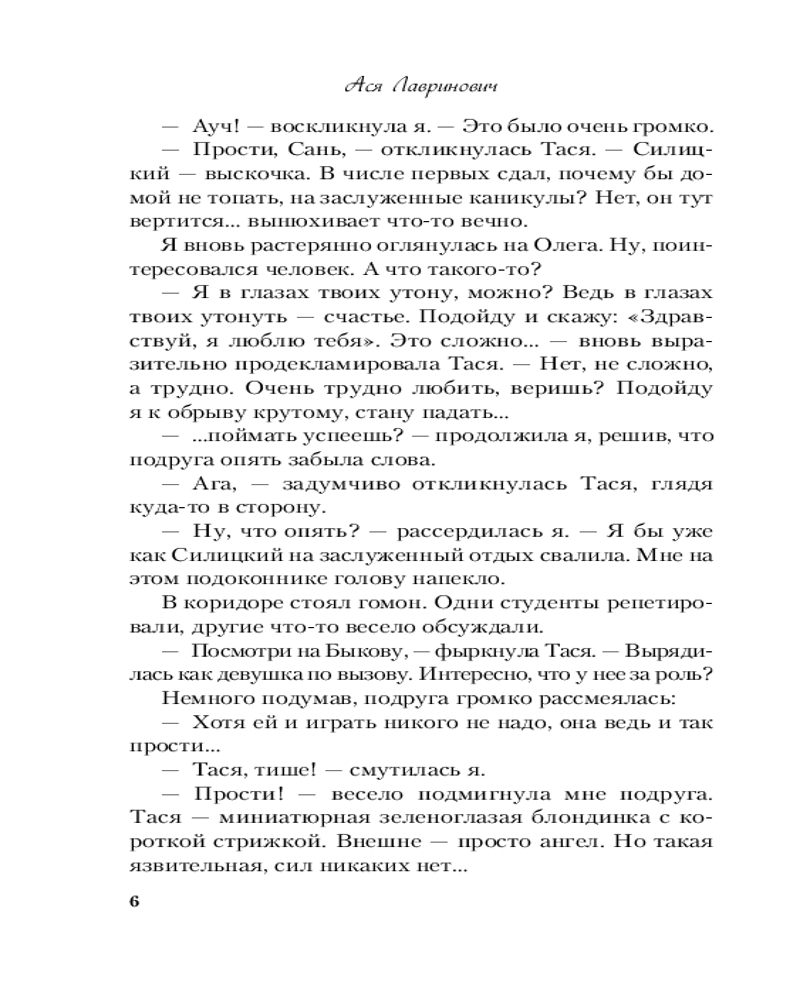 Люблю книги Аси. Новинка отлично зайдет летним вечером во время дачного или пляжного отдыха. Любовная история здесь не такая яркая, как в, например, "Нелюбви сероглазого короля" или в "Не дружи со мной", но все равно ставлю пять звёзд.