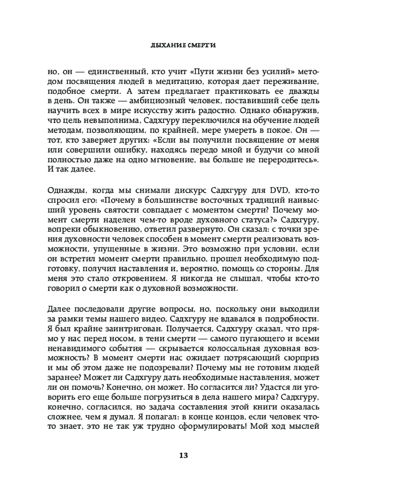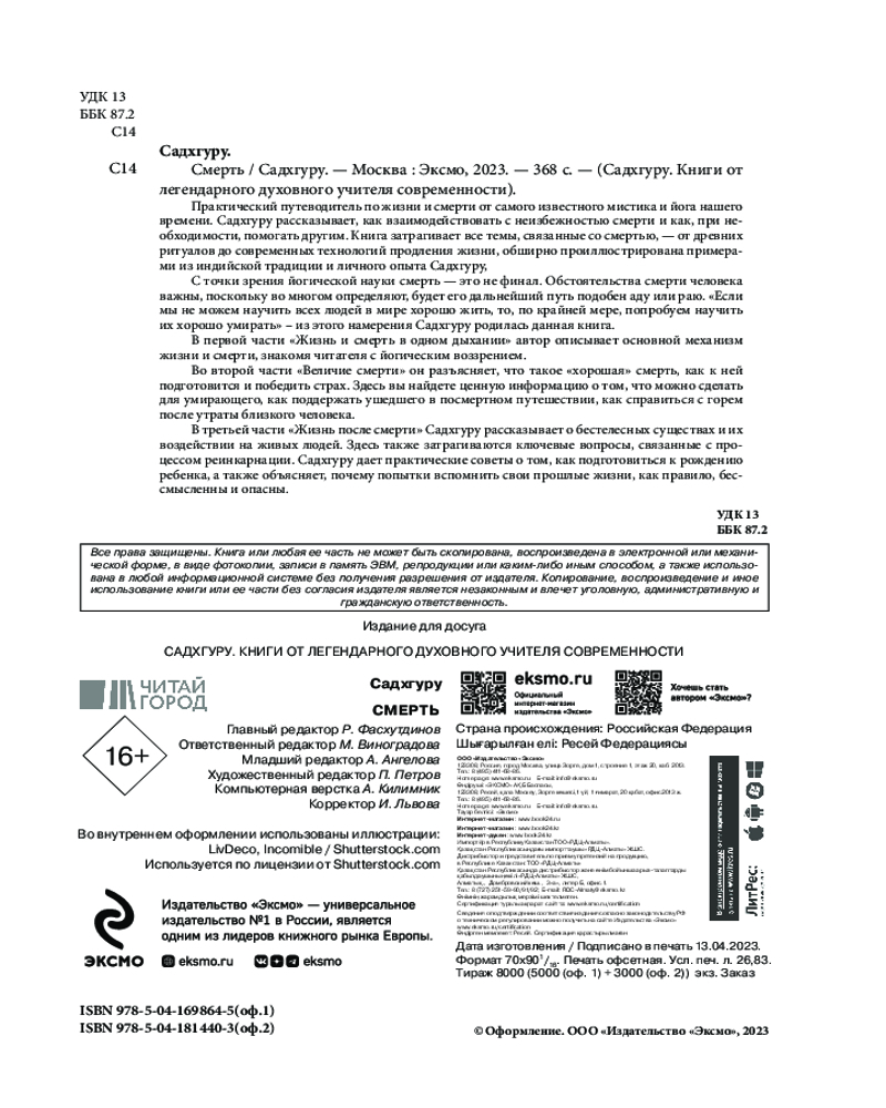 💳 Оплатить за товар можно при получении 🇰🇿 Есть бесплатная доставка по Казахстану от 1 дня 🎁 Копите бонусы с каждой покупки Серия: Садхгуру. Книги от легендарного духовного учителя современности Все, что вы хотели и боялись узнать о смерти — в изложении Садхгуру, самого известного йога и мистика нашего времени. Смерть — это не финал. Смерть неизбежна. Как можно игнорировать столь важный аспект жизни, обладая человеческим разумом? Как можно избегать его и вести себя так, словно вам предстоит жить вечно? Как так вышло, что, проведя миллионы лет на этой планете, люди до сих пор ни черта не знают о смерти? |
