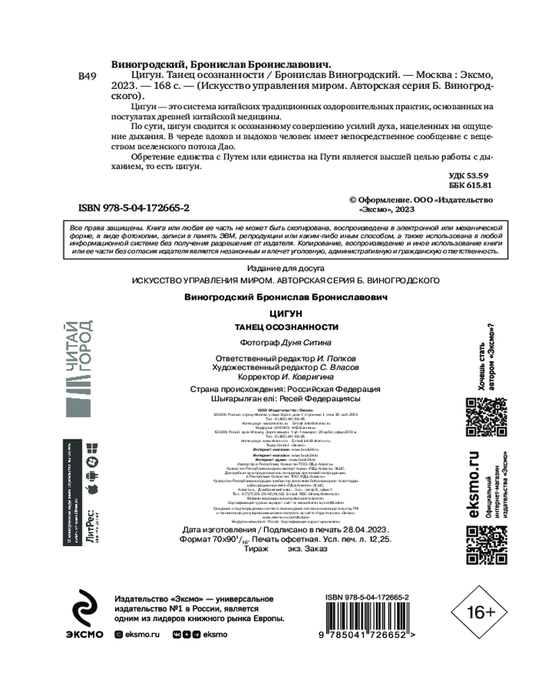 💳 Оплатить за товар можно при получении 🇰🇿 Есть бесплатная доставка по Казахстану от 1 дня 🎁 Копите бонусы с каждой покупки Серия: Искусство управления миром. Авторская серия Б. Виногродского Цигун — это система китайских традиционных оздоровительных практик, основанных на постулатах древней китайской медицины. По сути, цигун сводится к осознанному совершению усилий духа, нацеленных на ощущение дыхания.В череде вдохов и выдохов человек имеет непосредственное сообщение с веществом вселенского потока Дао. Обретение единства c Путем или единства на Пути является высшей целью работы с дыханием, то есть цигун. |
