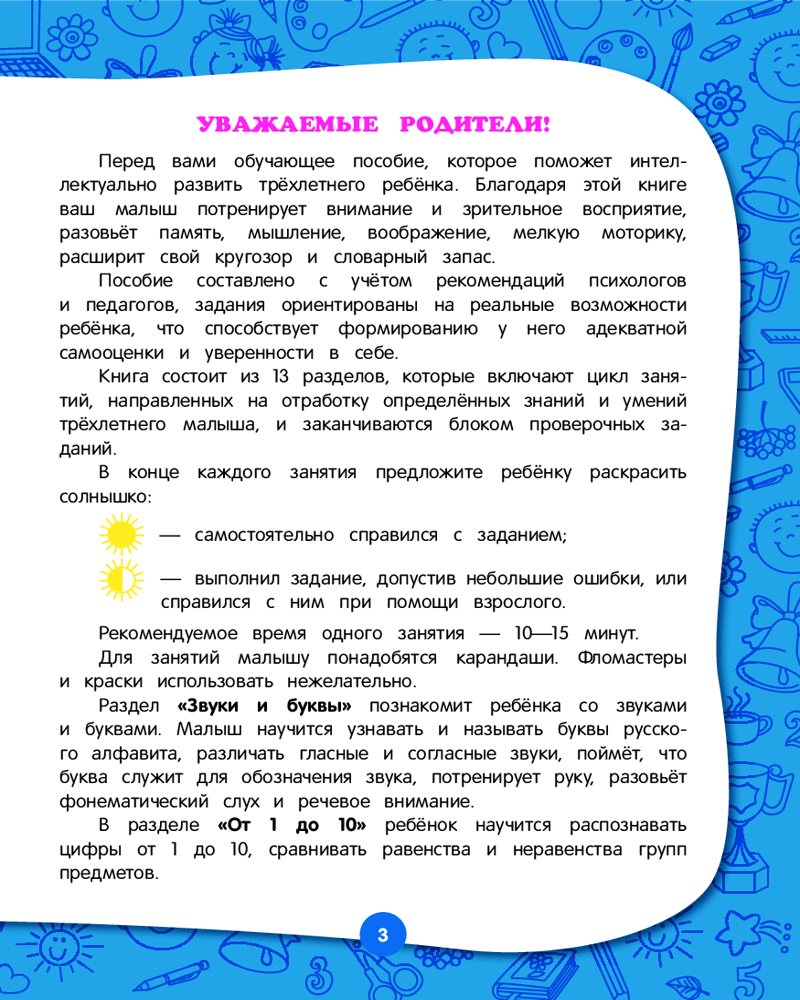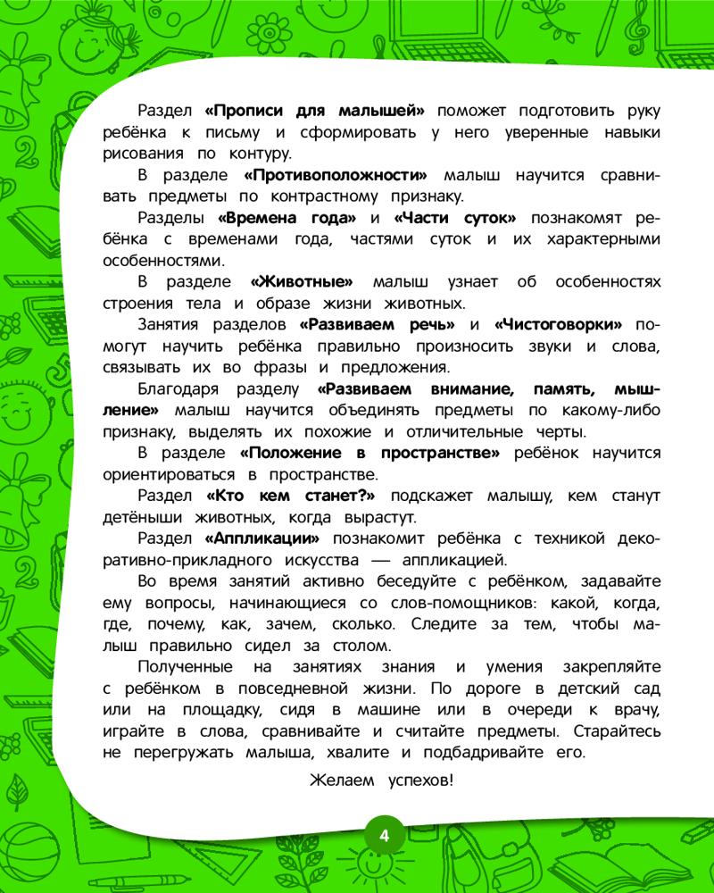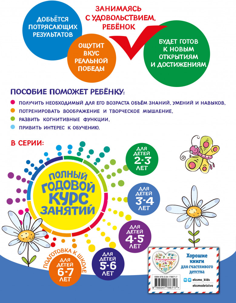💳 Оплатить за товар можно при получении 🇰🇿 Есть бесплатная доставка по Казахстану от 1 дня 🎁 Копите бонусы с каждой покупки Серия: Полный годовой курс занятий В основе книги лежит авторская методика, гарантирующая высокие результаты. Авторы учли психологию современного ребенка. Теперь не надо думать, как заинтересовать ребенка или покупать много пособий. Всё, что нужно для развития малыша — в одной книге! Она состоит из 17 разделов и заканчивается проверочными заданиями. Занимаясь, малыш выучит буквы и цифры, разовьет моторику, внимание, память, мышление, речь, научится различать времена года и части суток, узнает много нового о животных, сделает первые аппликации. В конце каждого занятия ребенок должен оценить свою работу — раскрасить солнышко, если справился с заданием, и половину солнышка, если допустил ошибки или попросил помощи взрослого. Это позволяет развивать ответственность и самостоятельность у малыша. |