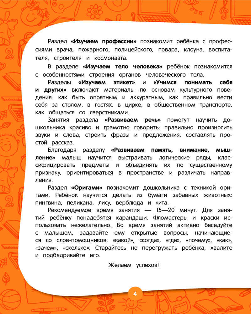 💳 Оплатить за товар можно при получении 🇰🇿 Есть бесплатная доставка по Казахстану 🎁 Копите бонусы с каждой покупки Серия: Полный годовой курс занятий В основе книги лежит авторская методика, гарантирующая высокие результаты. Авторы учли психологию современных детей. Теперь не нужно думать, как заинтересовать ребенка, или покупать много пособий. Все необходимое для года занятий есть в одной книге. Пособие состоит из 10 разделов и заканчивается проверочными заданиями. Занимаясь, ребенок освоит порядковый счет и познакомится с составом числа, научится читать, сможет развить когнитивные функции, освоит технику оригами, узнает правила этикета, поймет, какие эмоции проявляют люди. |