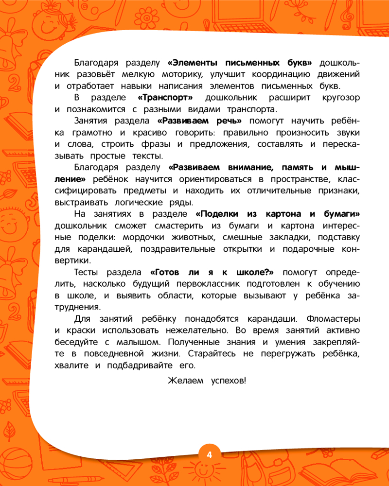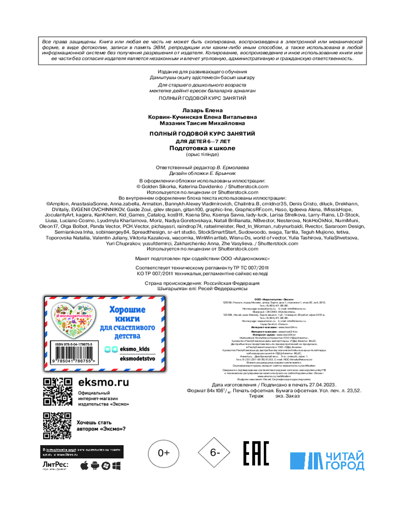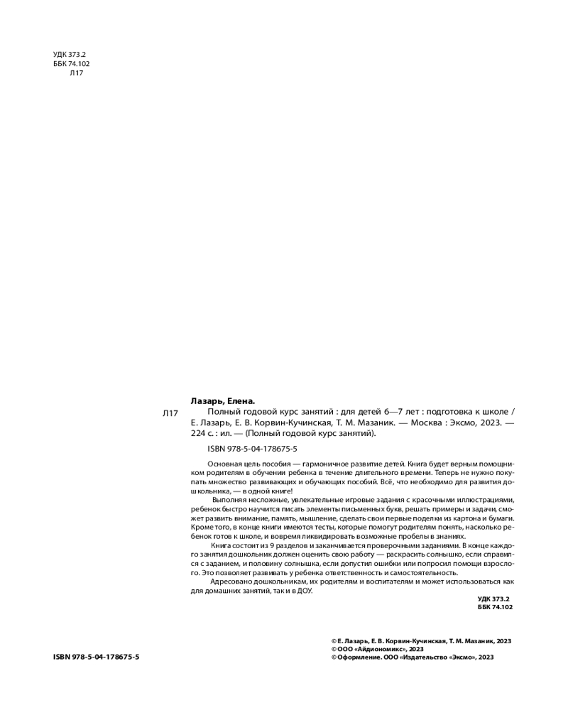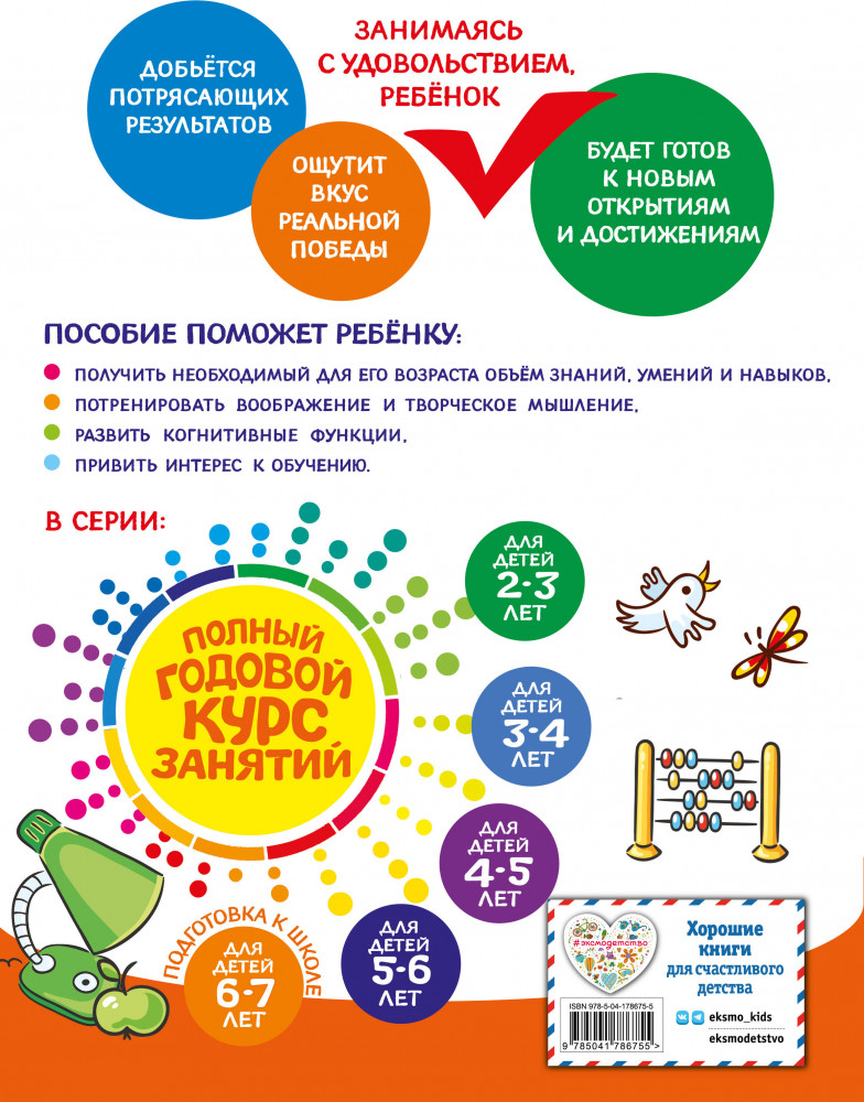 Полный годовой курс занятий: для детей 6-7 лет. Подготовка к школеТаисия Михайловна Мазаник, Елена Витальевна Корвин-Кучинская, Елена Лазарь В данный момент этот товар отсутствует в продаже. Возможно, у нас найдется аналогичный или похожий товар здесь. Серия: Полный годовой курс занятий В основе книги лежит авторская методика, гарантирующая высокие результаты. Авторы учли психологию современных детей. Теперь не нужно думать, как заинтересовать ребенка, или покупать много пособий. Все необходимое для года занятий есть в одной книге. |