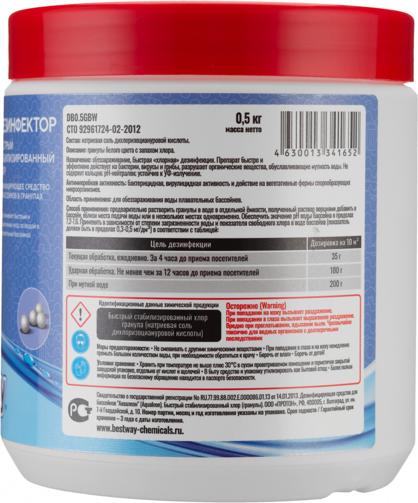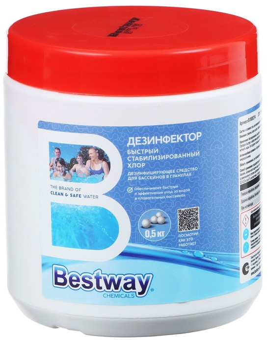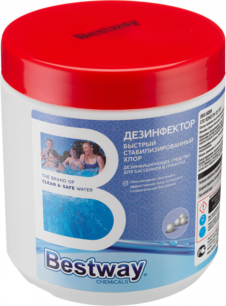 Дезинфектор Bestway быстро стабилизированный хлор в гранулах обеззараживает и дезинфицирует воду бассейна. Препарат стремительно и эффективно действует на бактерии, вирусы и грибы, разрушает органические вещества, обуславливающие мутность воды. Не содержит кальция, рН-нейтрален, устойчив к УФ-излучению. Гранулы белого цвета для ручной обработки воды частных бассейнов, содержат 60% активного, натриевую соль дихлоризоциануровой кислоты. |