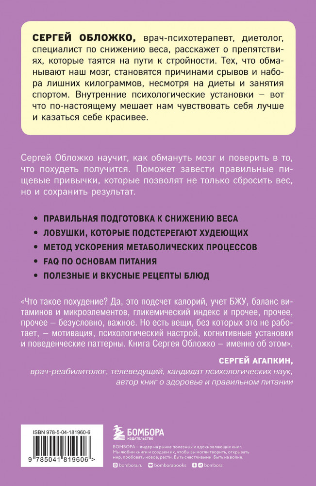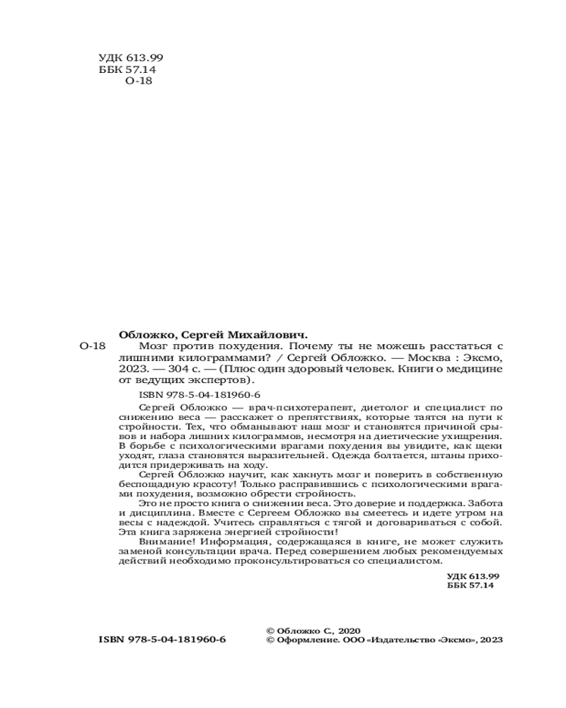 💳 Оплатить за товар можно при получении 🇰🇿 Есть бесплатная доставка по Казахстану от 1 дня 🎁 Копите бонусы с каждой покупки Серия: Плюс один здоровый человек. Книги о медицине от ведущих экспертов Специалист по снижению веса Сергей Обложко расскажет о коварных препятствиях, которые таятся на пути к стройности и обманывают наш мозг. Что становится причиной «срывов» и набора лишних килограммов, несмотря на диетические ухищрения? |