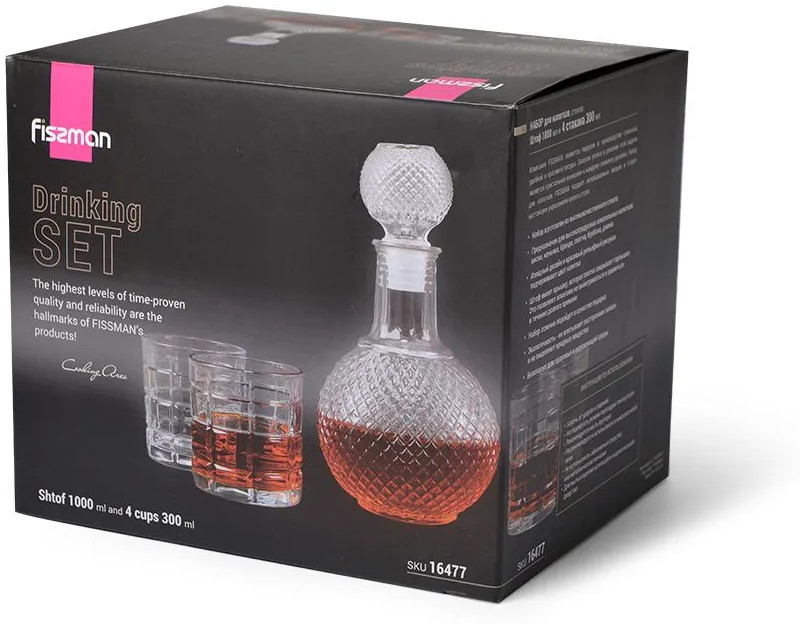 Fissman Набор для напитковВ данный момент этот товар отсутствует в продаже. Возможно, у нас найдется аналогичный или похожий товар здесь. Набор питьевой включает в себя 5 предметов: графин, четыре стакана. Графин и стаканы изготовлены из качественного прочного стекла. Предназначен для высокоградусных алкогольных напитков: виски, коньяка, бренди, скотча, бурбона, джин. Изящный дизайн и красивый рельефный рисунок подчеркивают цвет напитка. Штоф имеет крышку, которая плотно закрывает горлышко. Это позволяет алкоголю не выветриваться и храниться в течение долгого времени Такой набор будет отлично смотреться в повседневной и праздничной сервировке! |