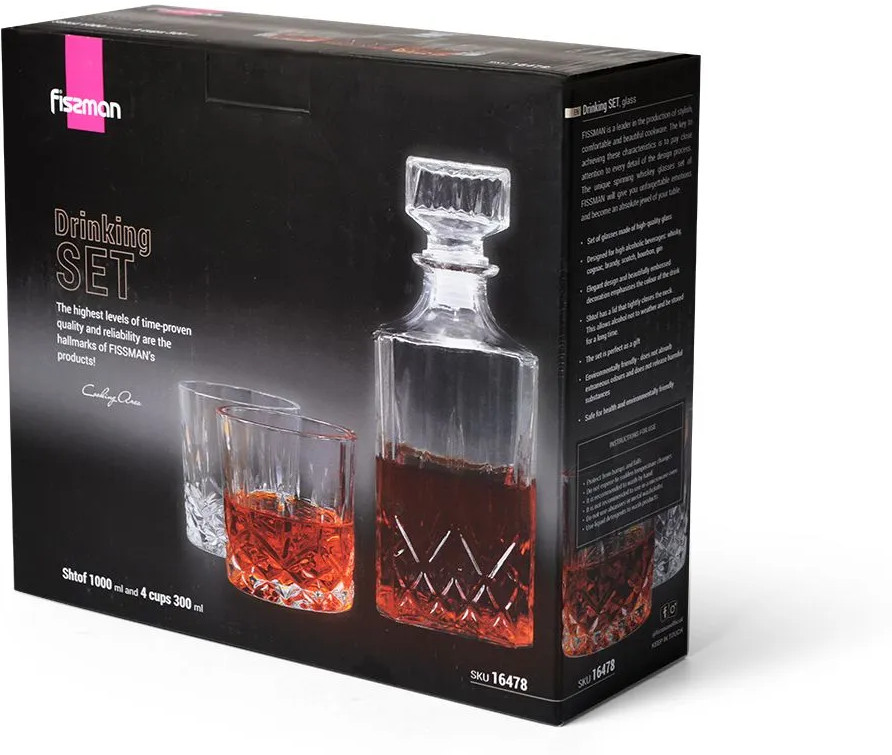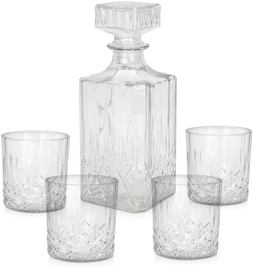 Набор питьевой включает в себя 5 предметов: графин, четыре стакана. Графин и стаканы изготовлены из качественного прочного стекла. Предназначен для высокоградусных алкогольных напитков: виски, коньяка, бренди, скотча, бурбона, джин. Изящный дизайн и красивый рельефный рисунок подчеркивают цвет напитка. Штоф имеет крышку, которая плотно закрывает горлышко. Это позволяет алкоголю не выветриваться и храниться в течение долгого времени. Изящный дизайн и красивый рельефный рисунок подчеркивают цвет напитка.Такой набор будет отлично смотреться в повседневной и праздничной сервировке!