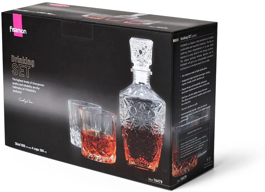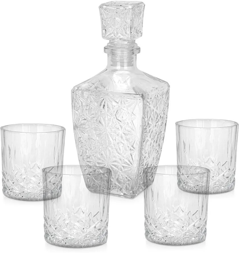 Набор питьевой включает в себя 5 предметов: графин, четыре стакана. Графин и стаканы изготовлены из качественного прочного стекла. Предназначен для высокоградусных алкогольных напитков: виски, коньяка, бренди, скотча, бурбона, джин. Изящный дизайн и красивый рельефный рисунок подчеркивают цвет напитка. Штоф имеет крышку, которая плотно закрывает горлышко. Это позволяет алкоголю не выветриваться и храниться в течение долгого времени. Изящный дизайн и красивый рельефный рисунок подчеркивают цвет напитка. Такой набор будет отлично смотреться в повседневной и праздничной сервировке!