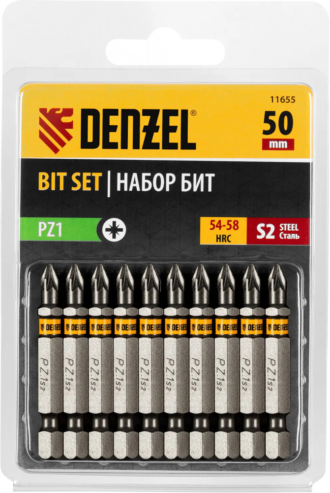 Набор бит PZ1×50 мм Denzel включает в себя 10 насадок из стали S2 с хвостовиком 1/4", рассчитанных на работу с шуруповертом. Оснастка служит для монтажа и демонтажа шурупов, саморезов и других резьбовых соединений. Шлиц PZ имеет 4 дополнительных ребра, за счет чего предотвращается проскальзывание биты в крепеже, повышаются точность и эффективность работ. Удлиненное до 50 мм основание облегчает работу в труднодоступных местах.