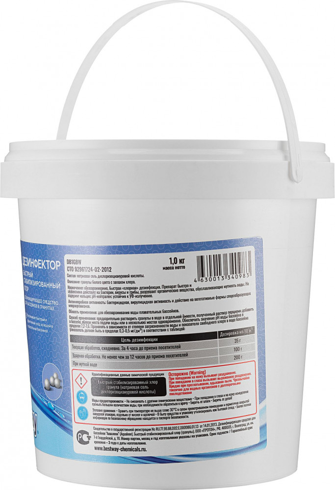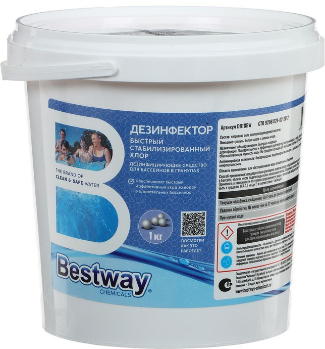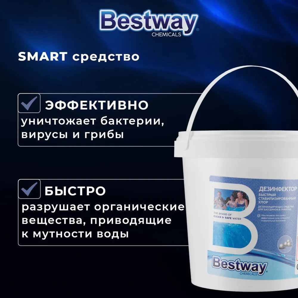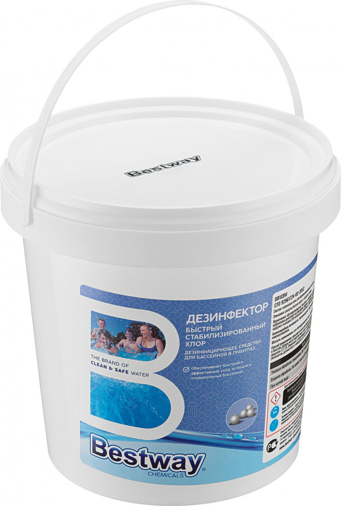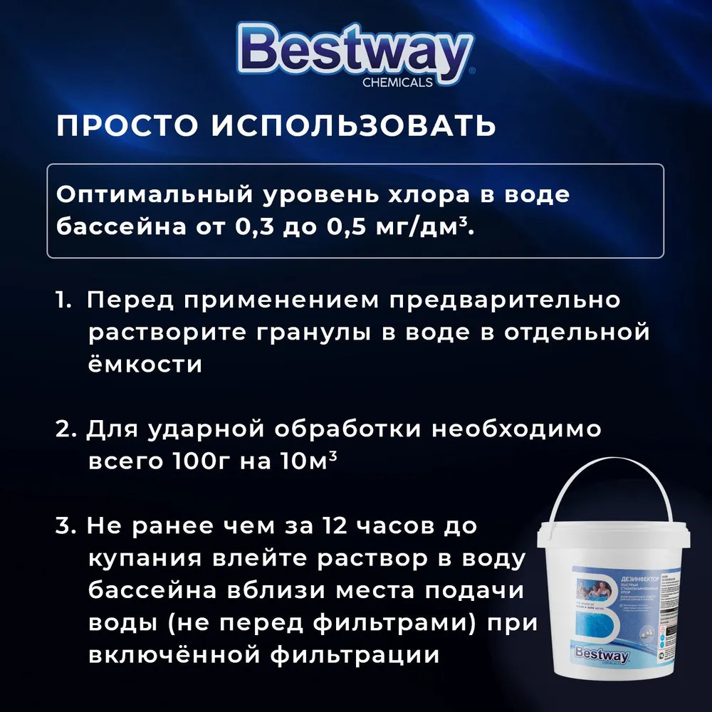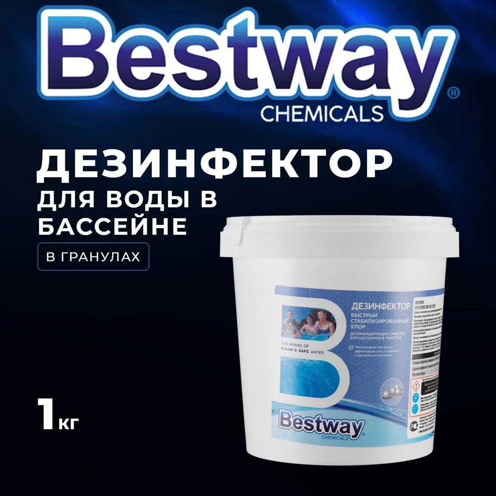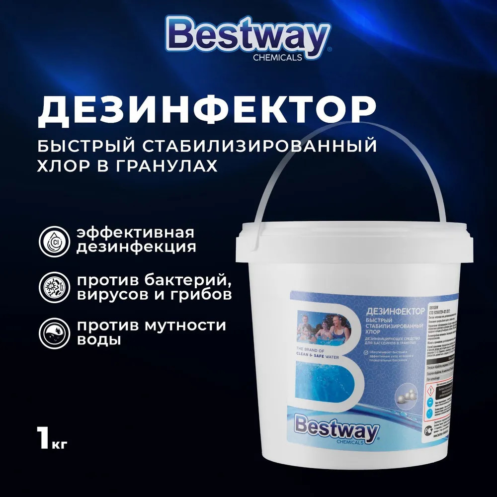 Дезинфектор Bestway — быстрый стабилизированный хлор в гранулах, обеззараживает дезинфицирует воду бассейна. Препарат стремительно и эффективно действует на бактерии, вирусы и грибы, разрушает органические вещества, обуславливающие мутность воды. Не содержит кальция, рН-нейтрален, устойчив к УФ-излучению. Гранулы белого цвета предназначены для ручной обработки воды частных бассейнов, содержат 60% активного, натриевую соль дихлоризоциануровой кислоты.