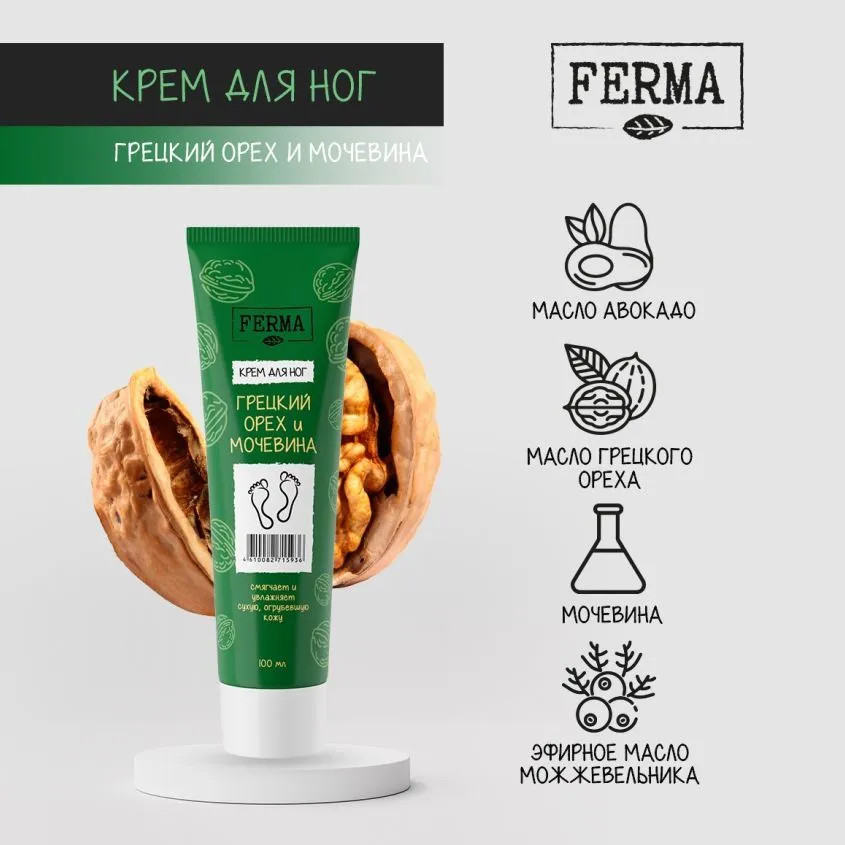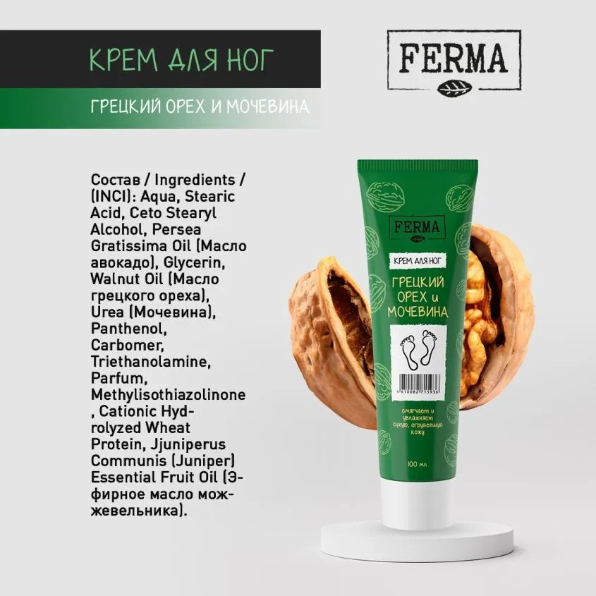Ferma Крем для ног «Грецкий орех и мочевина»В данный момент этот товар отсутствует в продаже. Возможно, у нас найдется аналогичный или похожий товар здесь. Насыщенная полезными веществами формула крема для ног питает и увлажняет сухую кожу. Входящие в состав масло грецкого ореха, масло авокадо и мочевина смягчают огрубевшую кожу стоп, борются с трещинами, обеспечивают глубокое увлажнение. Эфирное масло можжевельника обладает дезодорирующим свойством. |