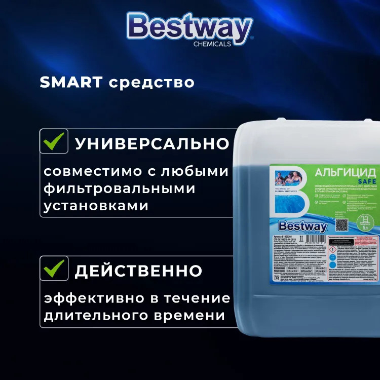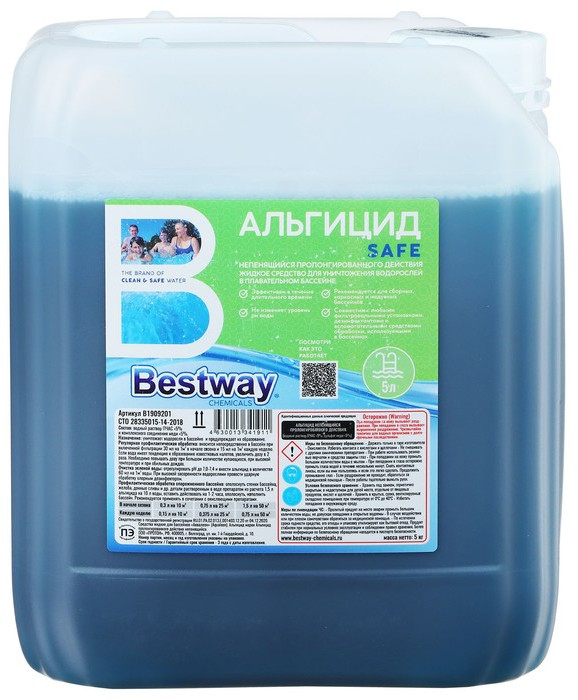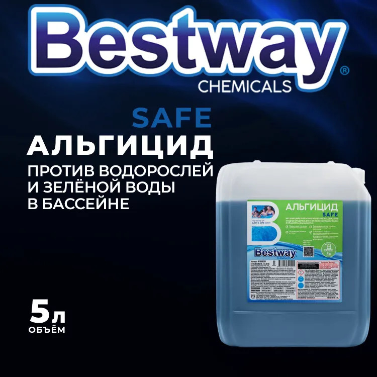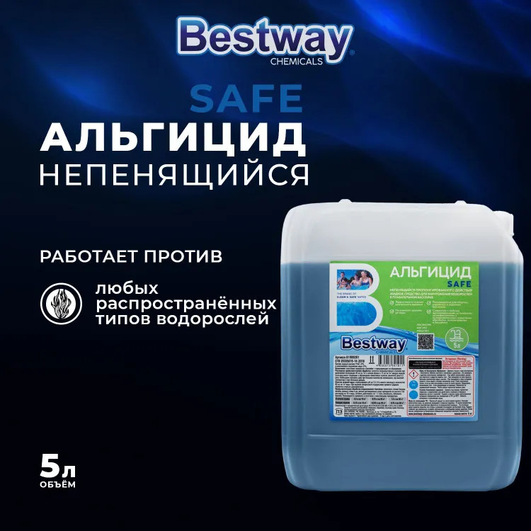 Альгицид Bestway непенящийся пролонгированного действия уничтожает водоросли в воде бассейна и предупреждает их образование. Совместим с любыми фильтровальными установками, дезинфектантами и вспомогательными средствами обработки, используемыми в бассейнах. Не изменяет уровень рН воды. Эффективен в течение длительного времени. Рекомендуется для бассейнов и аквапарков. Состоит из водного раствора ПЧАС и комплексного соединения меди.