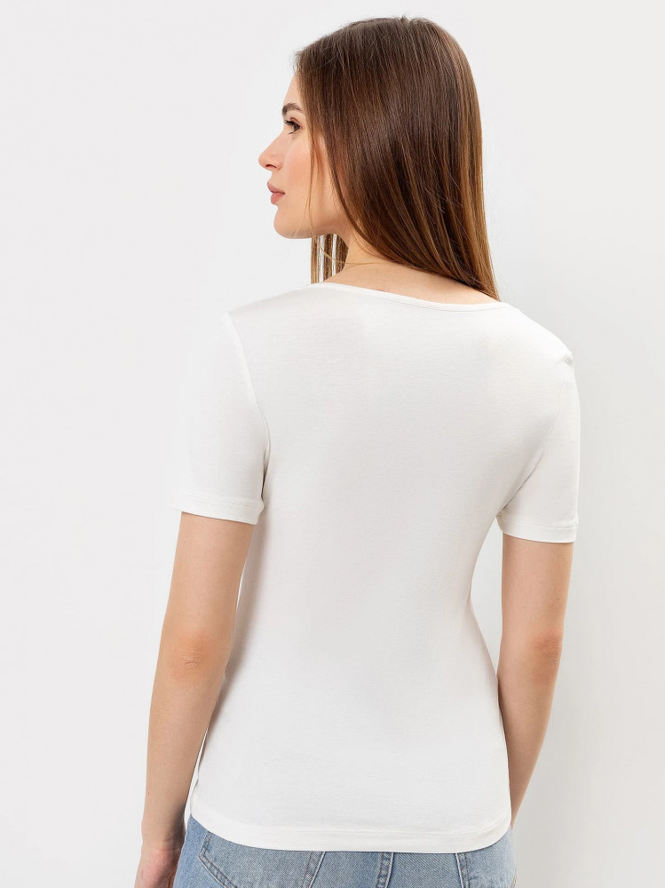 Футболка сидит как на фото, размер соответствует. Цвет не белоснежный, а с лёгким молочным оттенком, красивый. Ткань тонкая, мягкая, чуть просвечивает. Пошив качественный