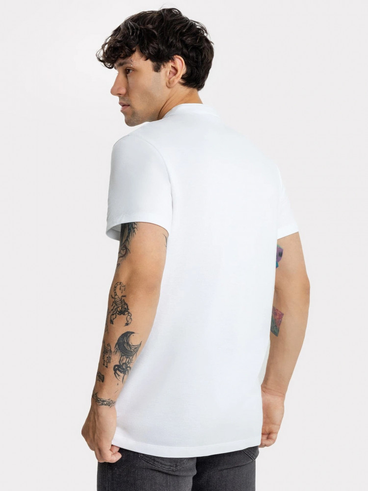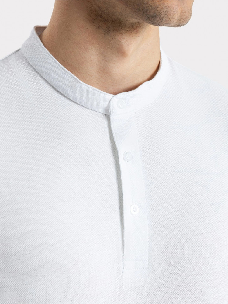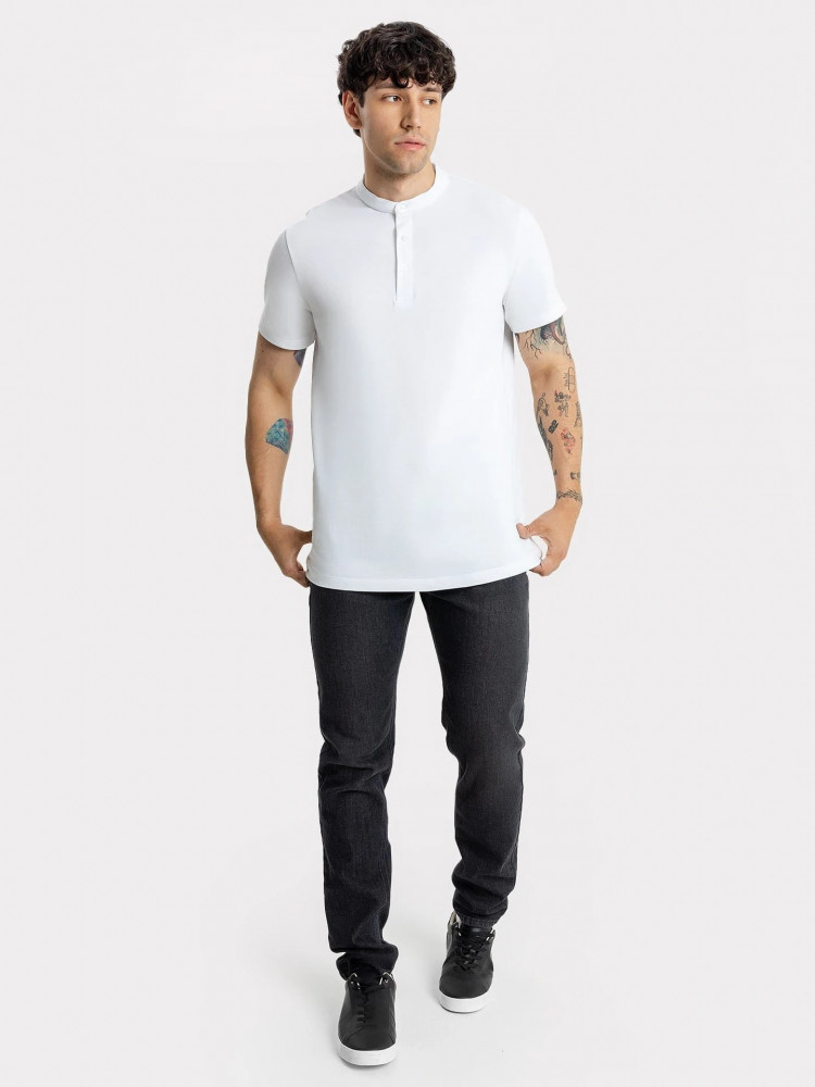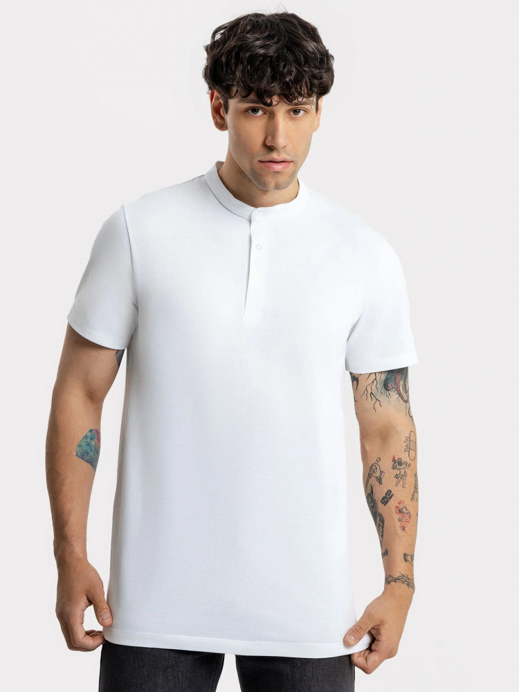 Стильная футболка поло с оригинальным воротником-стойкой и удобной застежкой на 3 пуговицы. Благодаря лаконичному дизайну, прямому силуэту и комфортной длине до середины бедер она наверняка станет любимой в гардеробе, ведь отлично подходит практически ко всему.
