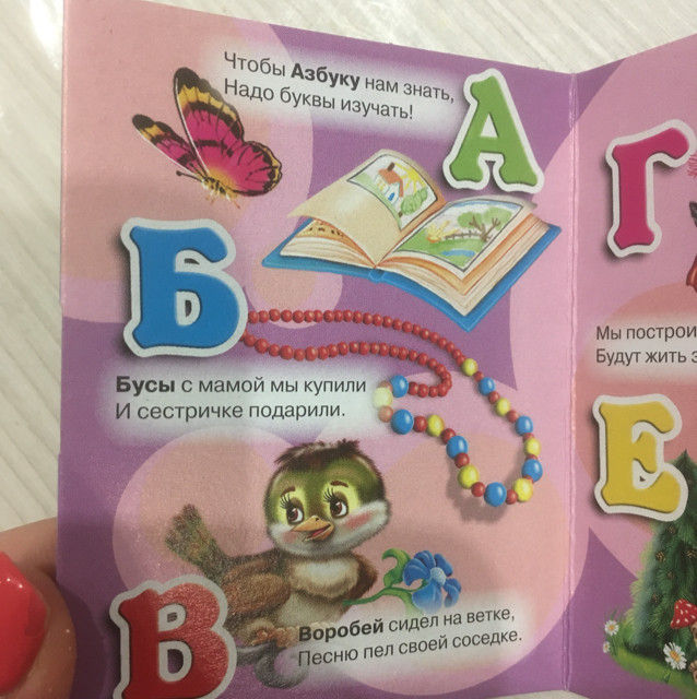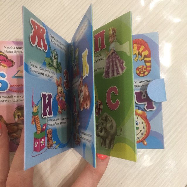 Книжка - малышка размером с ладонь. Взяла для дочки 2,5 лет, ей держать в ручке удобно. Странички картонные, плотные. Картинки яркие.
