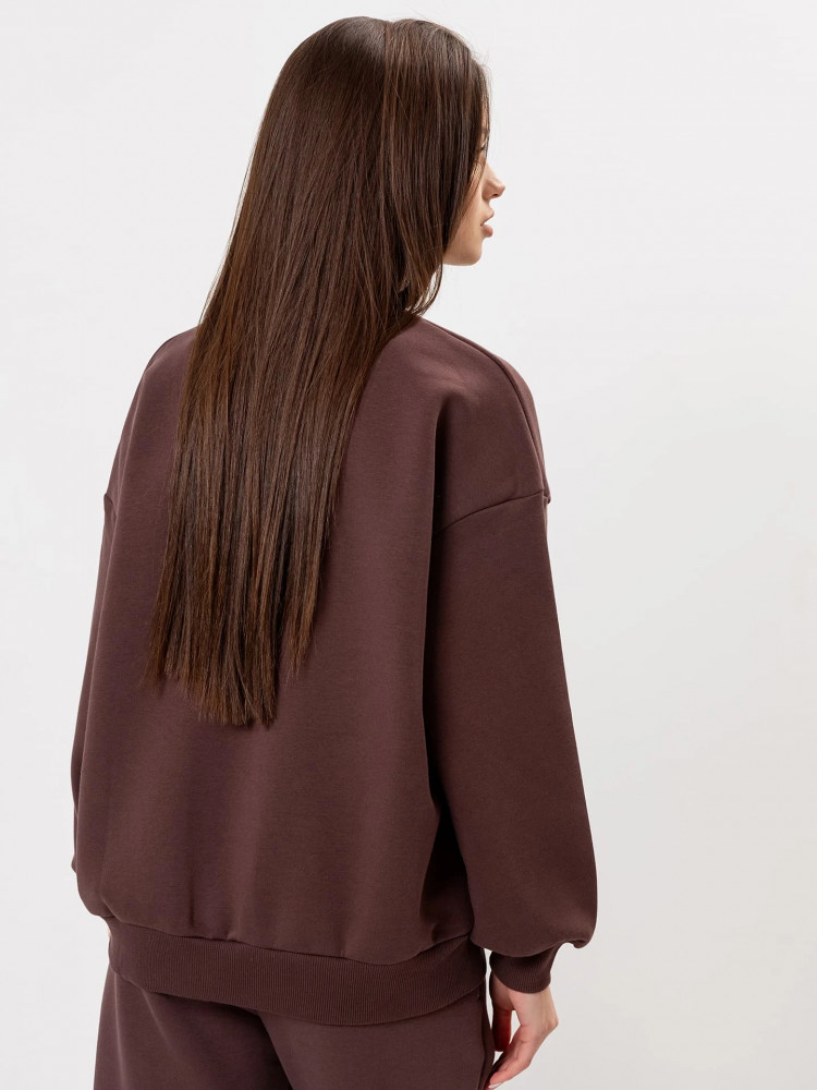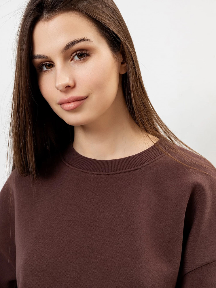 Богатый темно коричневый цвет, хороший материал, который не должен скатываться. Крепкие, аккуратные швы. Есть начес, на холодное время года.