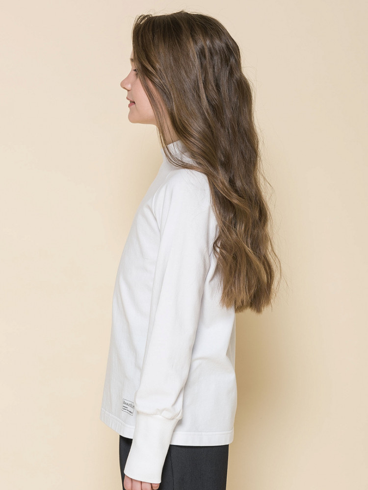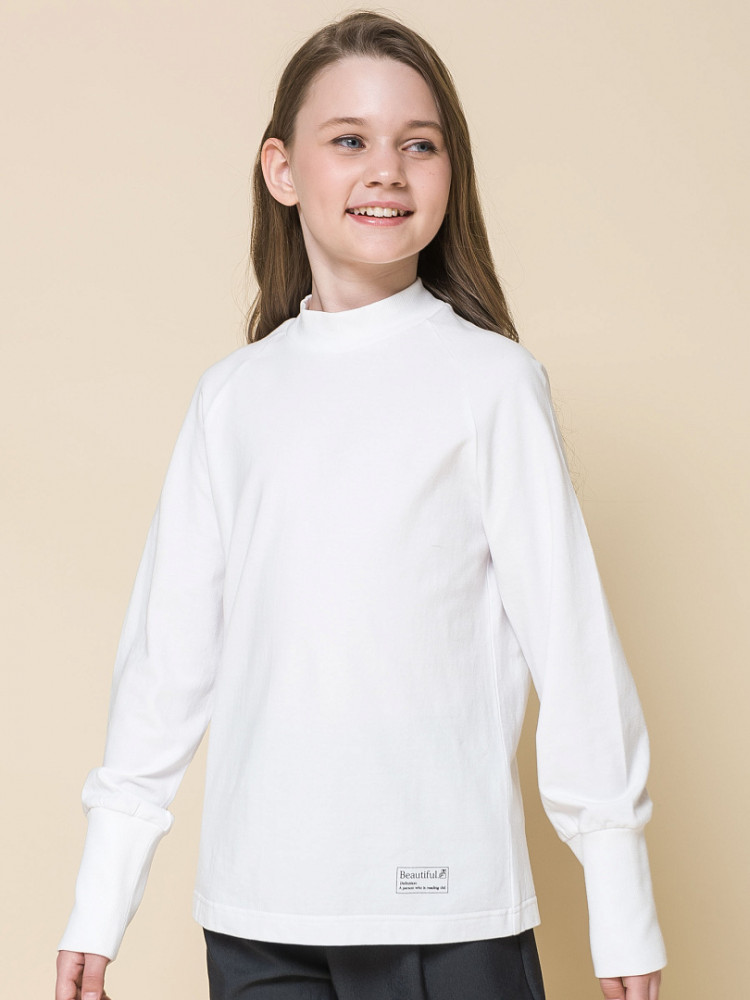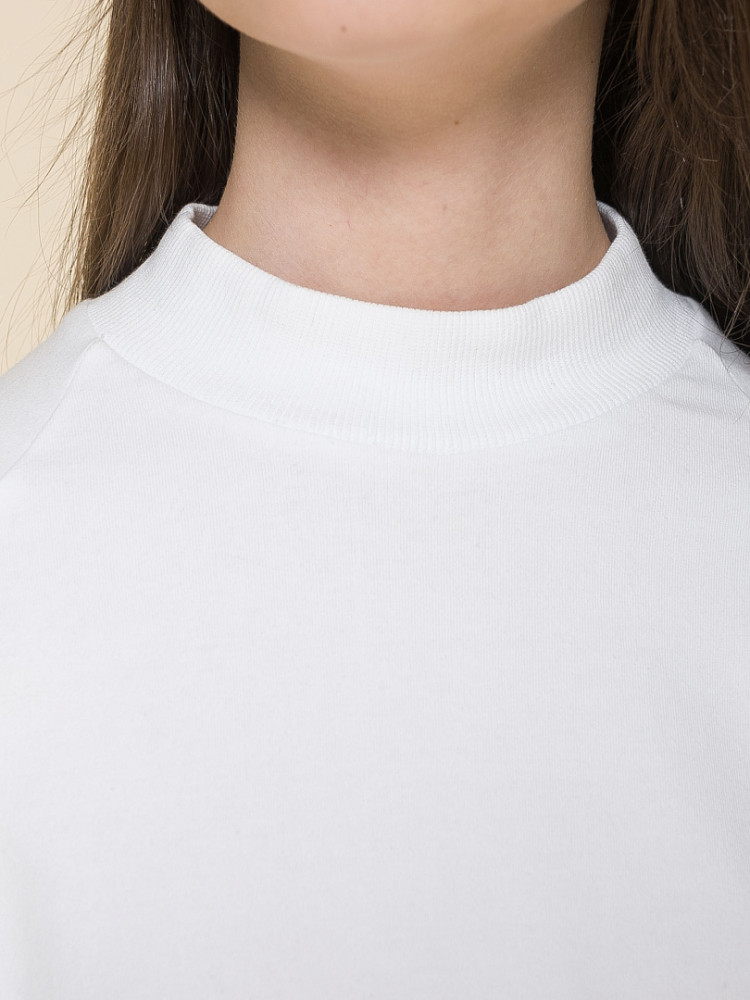 Трикотажная водолазка для девочек. Рукав реглан. Воротник стойка из рибаны без отворота. По низу рукава высокий манжет из рибаны.