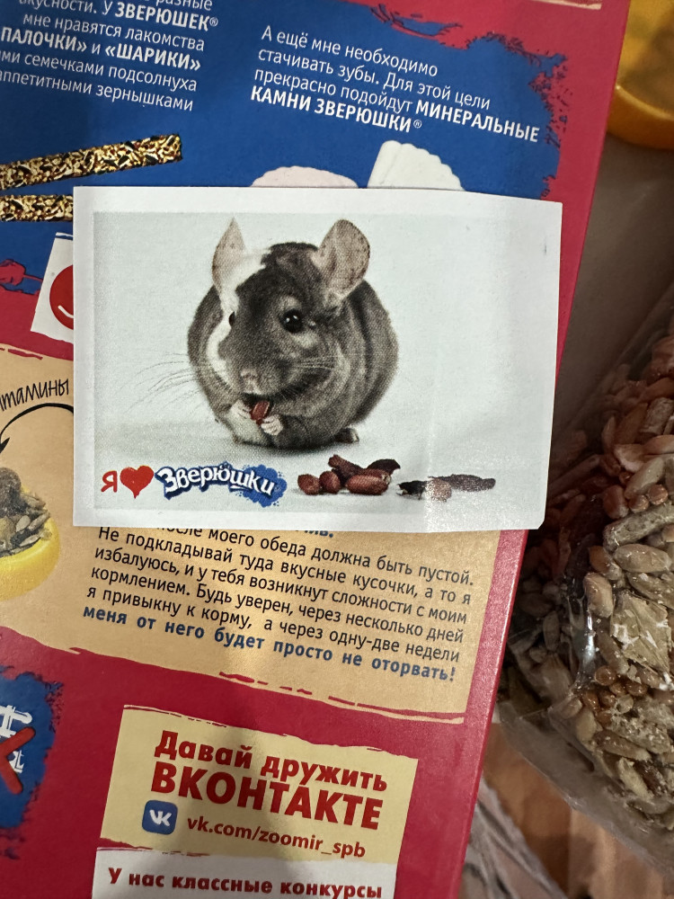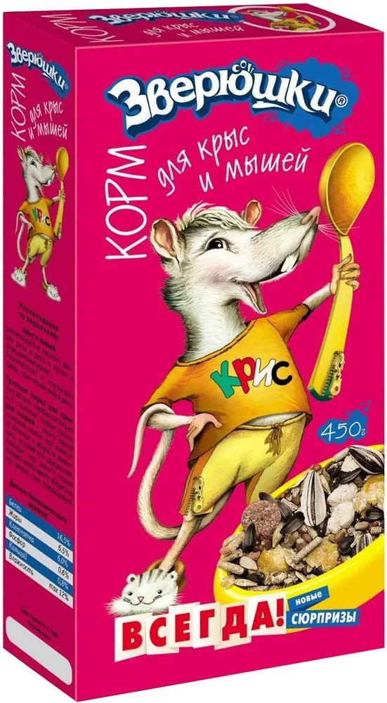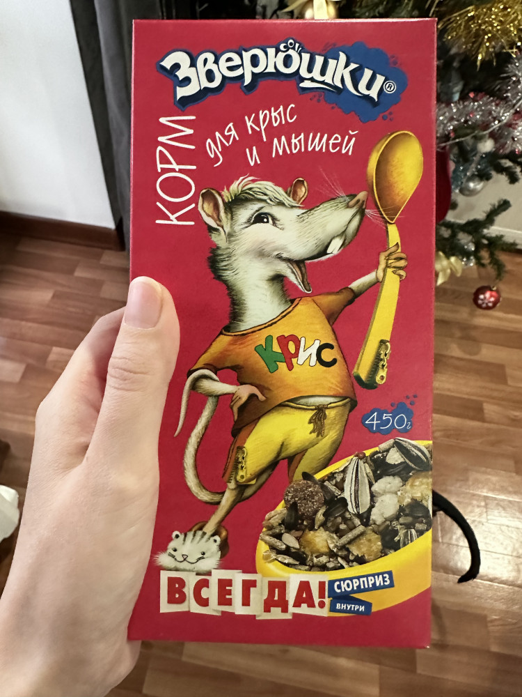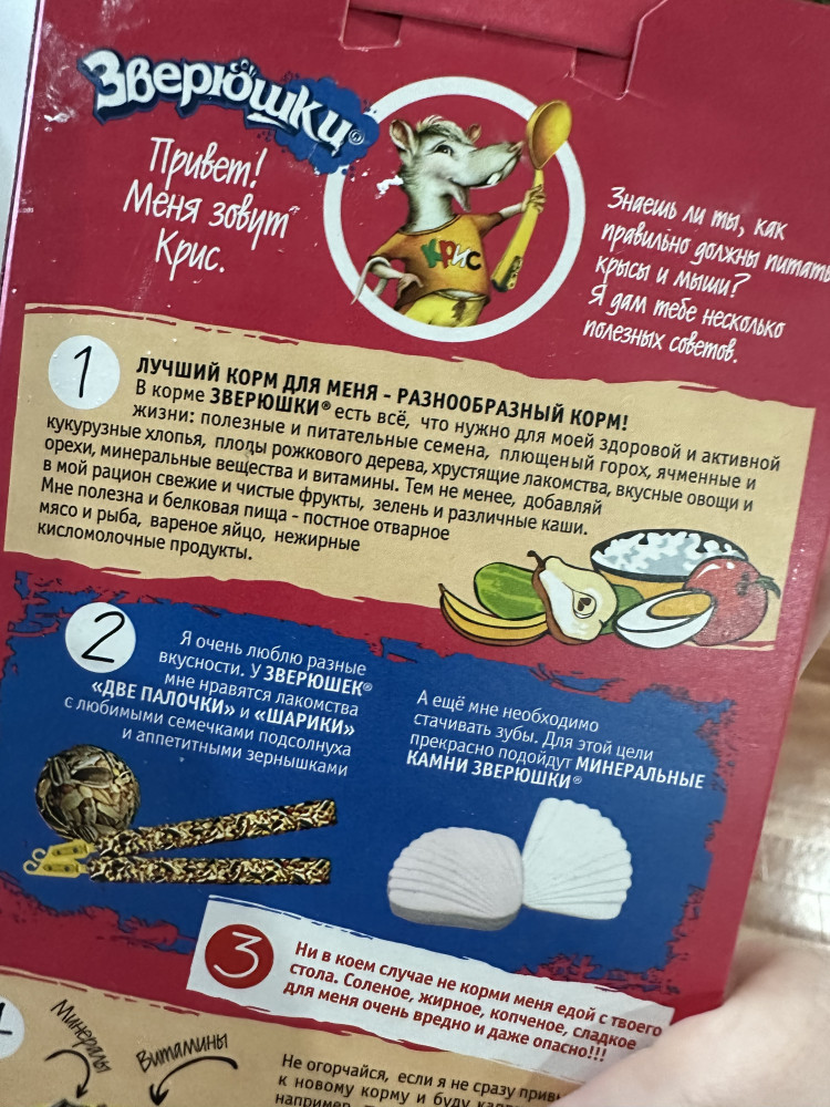 Один из самых хороших кормов, которые мы обычно берём. Мне и крысам нравится состав. Плюсы: - упаковка снаружи картон, внутри герметичный пакет, что защищает от попадания влажности и паразитов из вне. - состав корма, мне и крысам нравится. - хороший объем и не дорогая цена. - миленькая наклейка в пачке, мы собираем из них коллекцию и клеим на банку от другого корма, чтобы она была красивая.